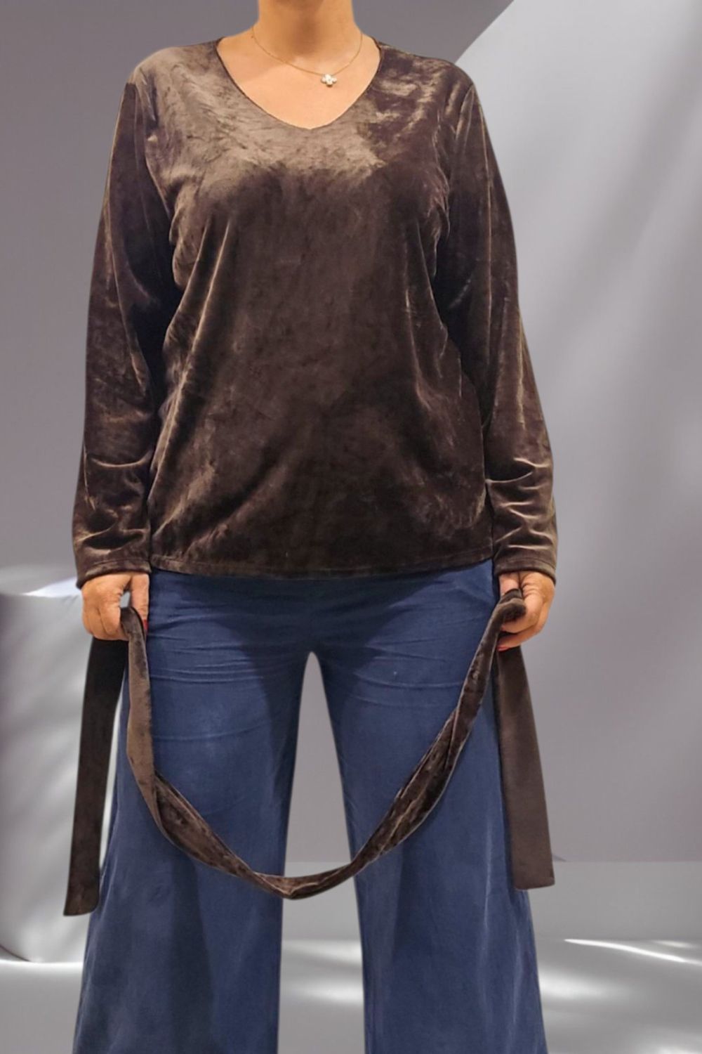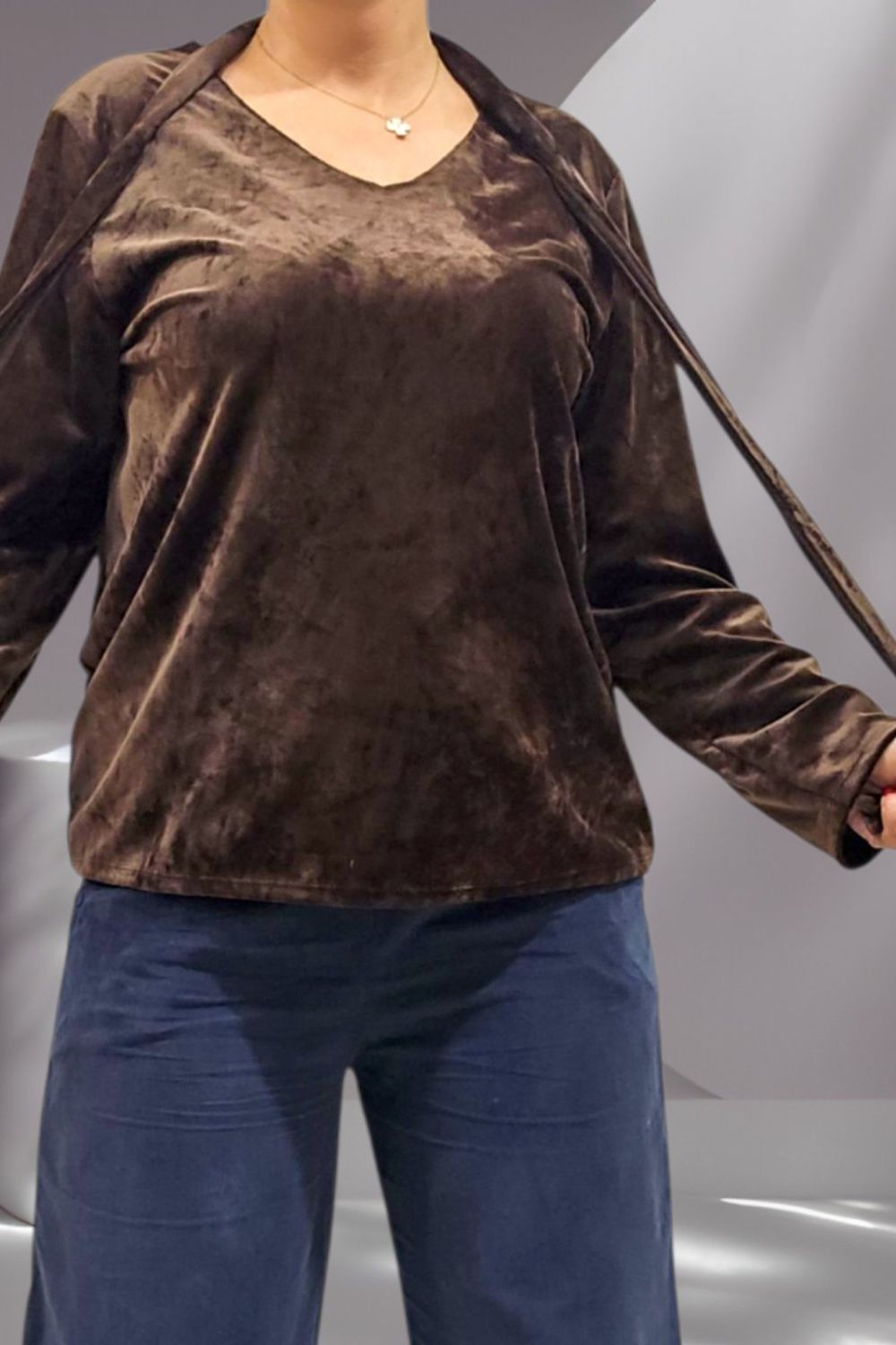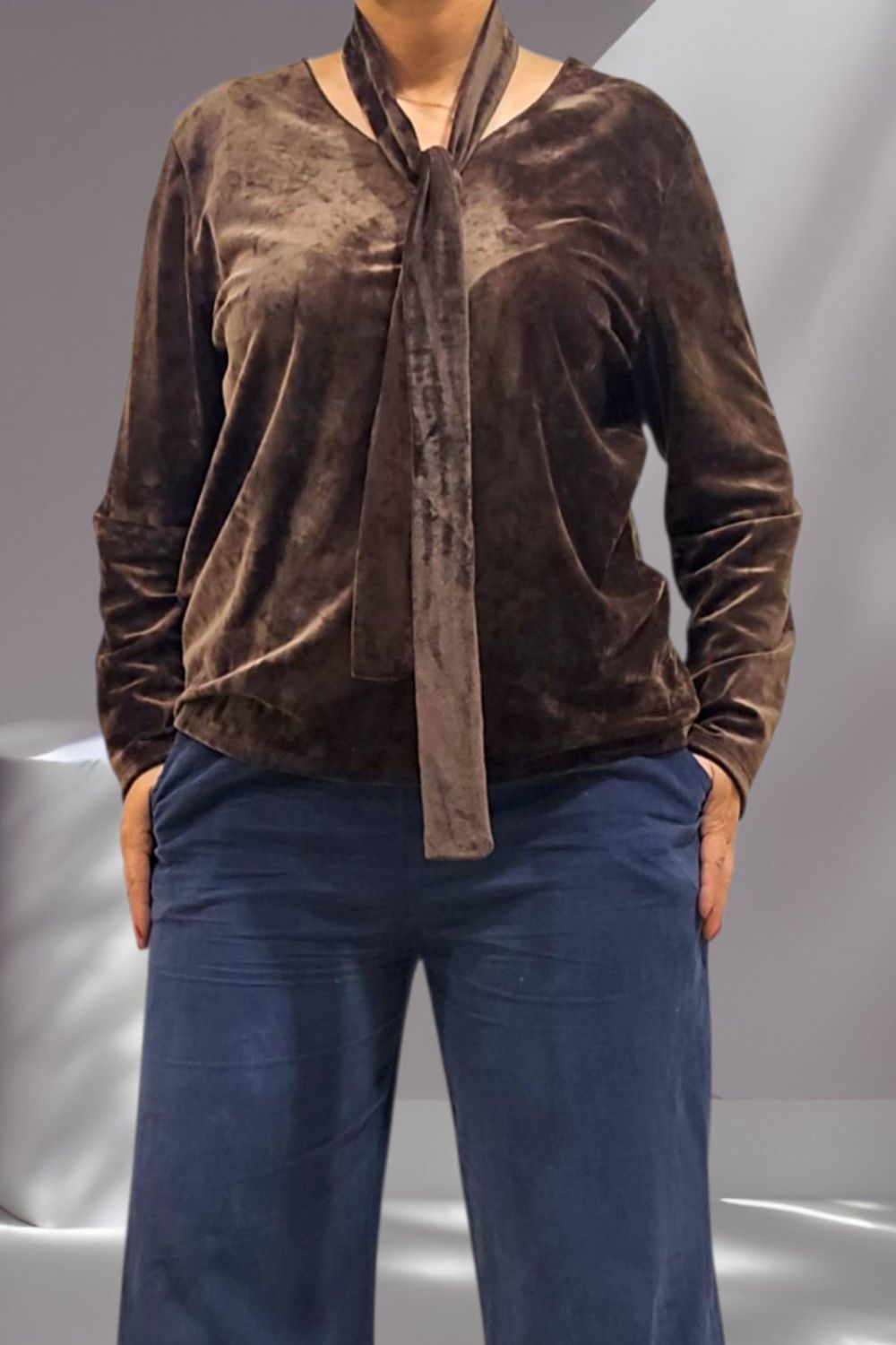 ΕΝΤΥΠΩΣΙΑΚΗ ΒΕΛΟΥΔΙΝΗ ΜΠΛΟΥΖΑ ΜΕ ΑΠΑΛΗ ΥΦΗ ΚΑΙ ΚΟΜΨΗ V ΛΑΙΜΟΚΟΨΗ . ΣΥΝΟΔΕΥΕΤΑΙ ΑΠΟ ΒΕΛΟΥΔΙΝΟ ΦΟΥΛΑΡΙ ΣΤΟ ΙΔΙΟ ΥΦΑΣΜΑ ΓΙΑ ΟΛΟΚΛΗΡΩΜΕΝΟ ELEGANT LOOK. ΣΥΝΘΕΣΗ 60% VISCOSE 35% POLYESTER 5% ELASTIN