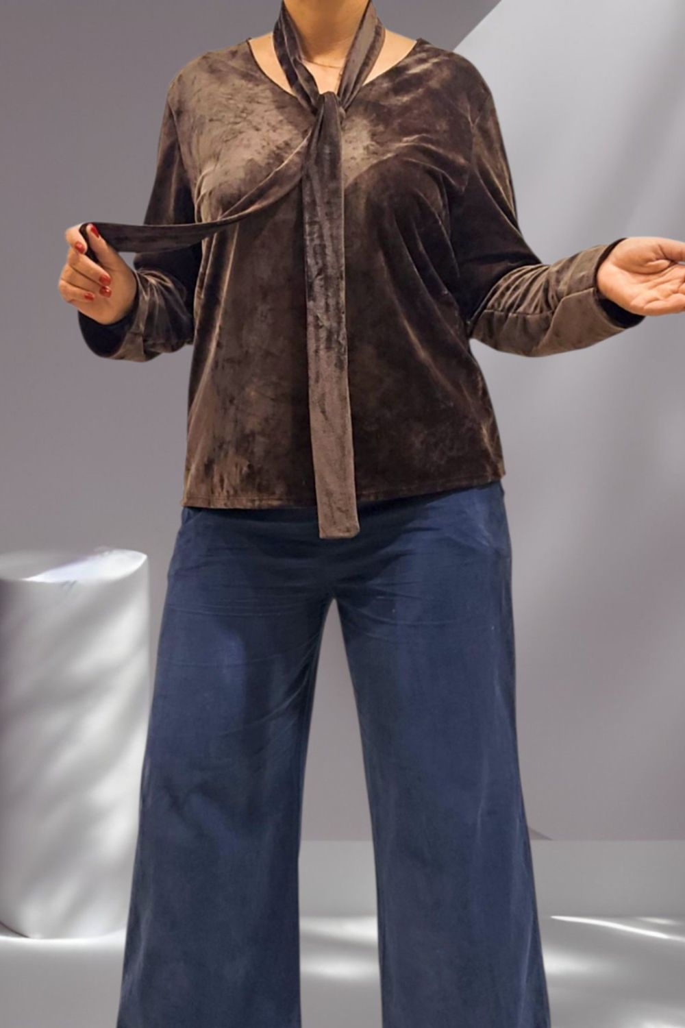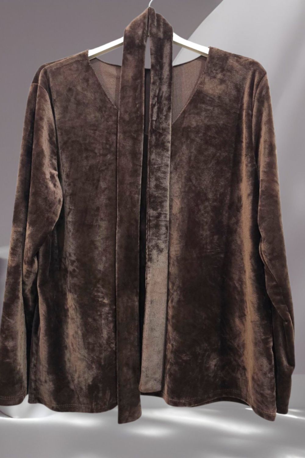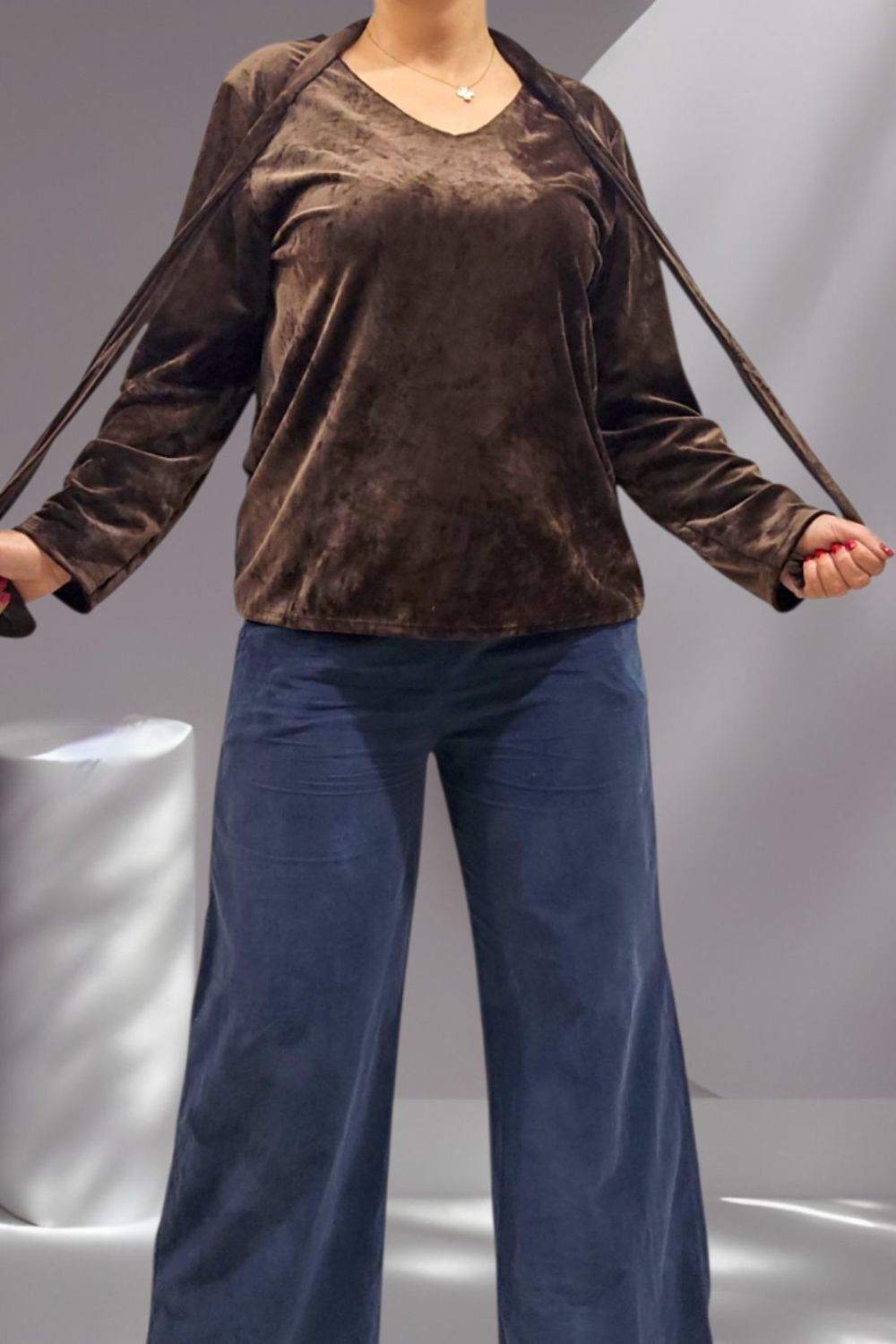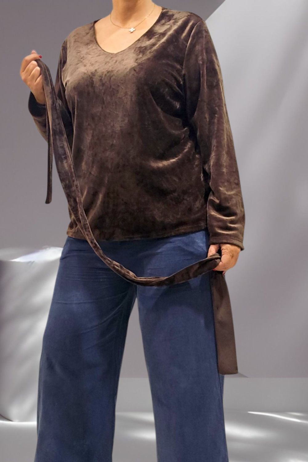 ΕΝΤΥΠΩΣΙΑΚΗ ΒΕΛΟΥΔΙΝΗ ΜΠΛΟΥΖΑ ΜΕ ΑΠΑΛΗ ΥΦΗ ΚΑΙ ΚΟΜΨΗ V ΛΑΙΜΟΚΟΨΗ . ΣΥΝΟΔΕΥΕΤΑΙ ΑΠΟ ΒΕΛΟΥΔΙΝΟ ΦΟΥΛΑΡΙ ΣΤΟ ΙΔΙΟ ΥΦΑΣΜΑ ΓΙΑ ΟΛΟΚΛΗΡΩΜΕΝΟ ELEGANT LOOK. ΣΥΝΘΕΣΗ 60% VISCOSE 35% POLYESTER 5% ELASTIN