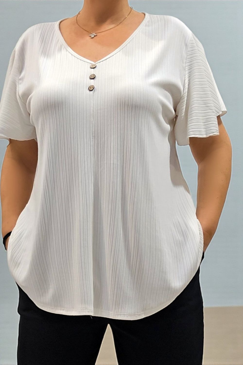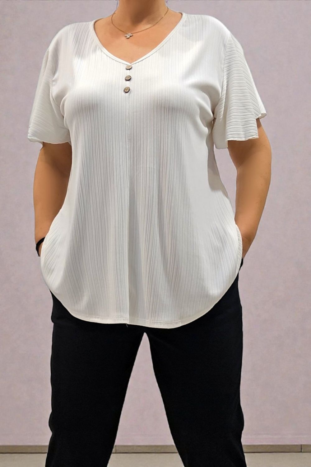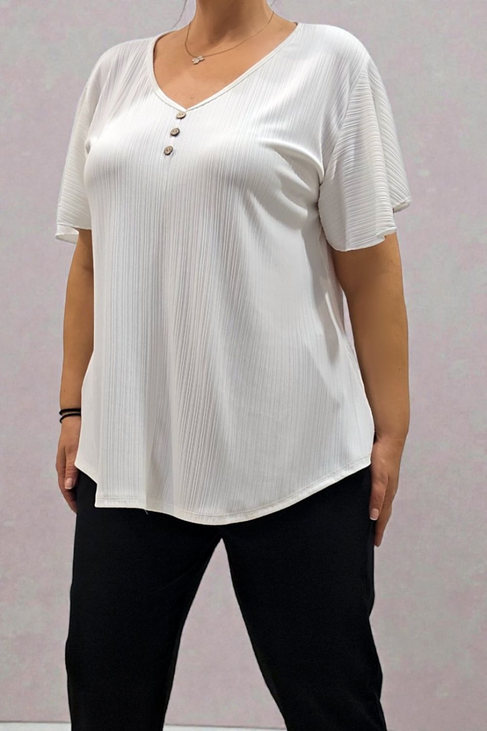 ΚΟΜΨΗ ΚΑΙ ΑΝΕΤΗ ΜΠΛΟΥΖΑ, ΣΕ ΑΕΡΙΝΗ ΓΡΑΜΜΗ, ΠΟΥ ΑΓΚΑΛΙΑΖΕΙ ΤΟ ΣΩΜΑ ΧΩΡΙΣ ΝΑ ΔΙΑΓΡΑΦΕΙ.ΚΑΤΑΣΚΕΥΑΣΜΕΝΗ ΑΠΟ ΕΛΑΦΡΥ ΑΝΑΓΛΥΦΟ ΥΦΑΣΜΑ ΜΕ ΚΑΘΕΤΗ ΥΦΗ,ΠΡΟΣΦΕΡΕΙ ΔΡΟΣΕΡΗ ΑΙΣΘΗΣΗ ΚΑΙ ΚΟΜΨΗ ΚΙΝΗΣΗ.ΔΙΑΘΕΤΕΙ V ΛΑΙΜΟΚΟΨΗ ΜΕ ΤΡΙΑ ΔΙΑΚΟΣΜΗΤΙΚΑ ΚΟΥΜΠΑΚΙΑ ΣΤΟ ΜΠΡΟΣΤΙΝΟ ΜΕΡΟΣ,ΠΟΥ ΠΡΟΣΘΕΤΟΥΝ ΜΙΑ ELEGANT ΛΕΠΤΟΜΕΡΕΙΑ.ΙΔΑΝΙΚΗ ΓΙΑ ΚΑΘΗΜΕΡΙΝΕΣ ΑΛΛΑ ΚΑΙ ΠΙΟ ΠΡΟΣΕΓΜΕΝΕΣ ΕΜΦΑΝΙΣΕΙΣ.ΑΠΟΤΕΛΕΙ ΕΝΑ MUST HAVE ΚΟΜΜΑΤΙ ΣΕ ΚΑΘΕ ΓΚΑΡΝΤΑΡΟΜΠΑ.ΣΥΝΘΕΣΗ 95% VISCOSE 5% ELASTIN.