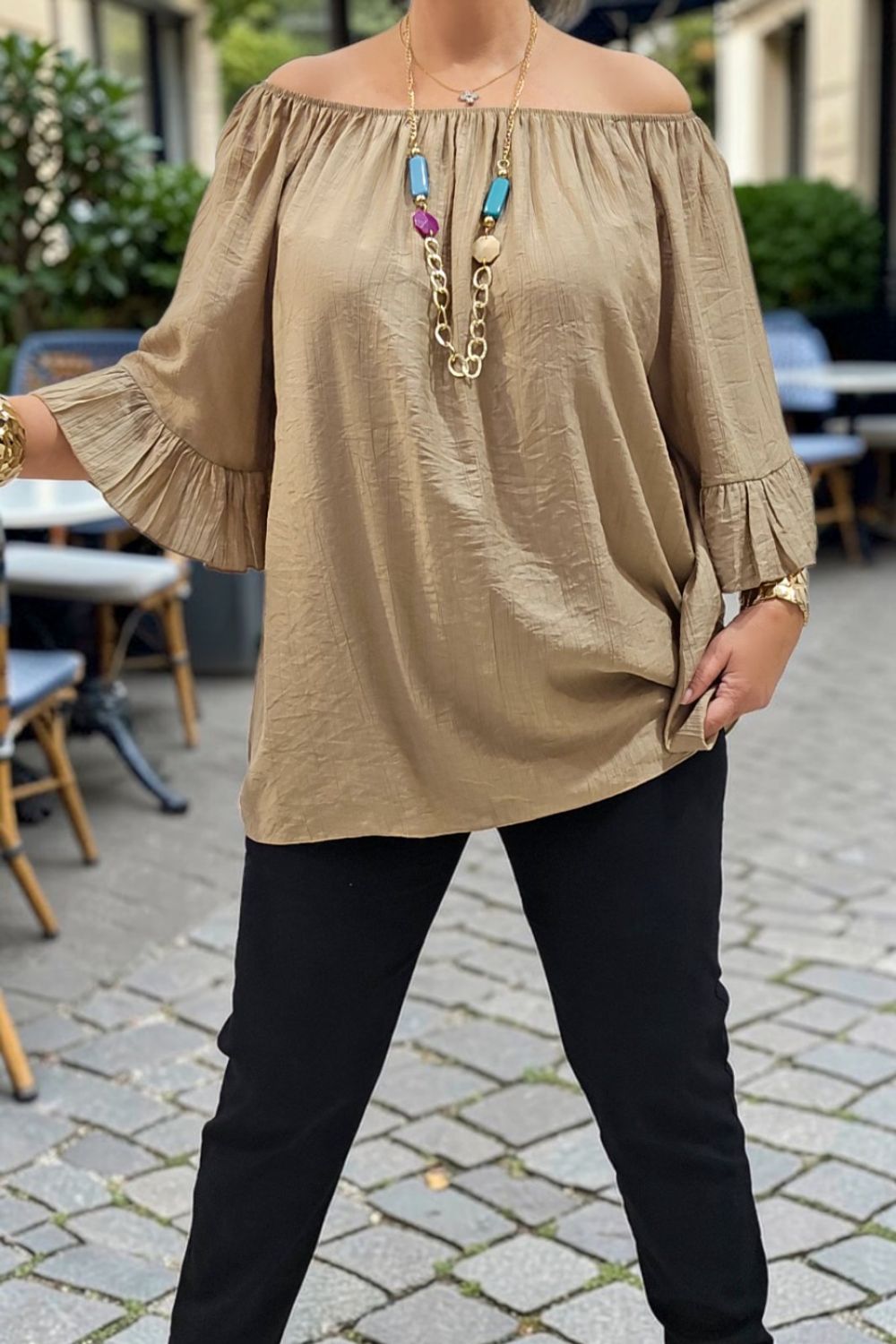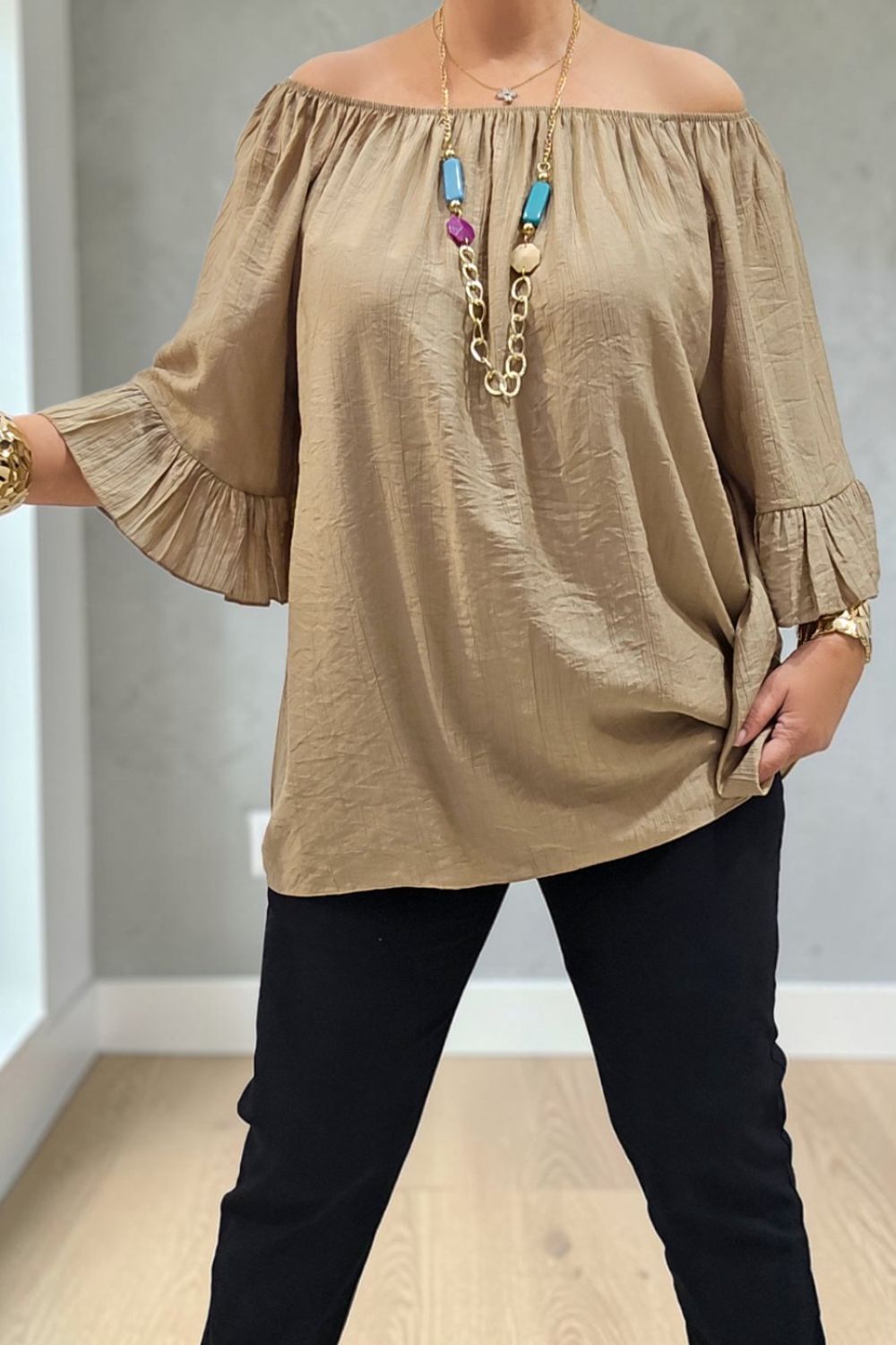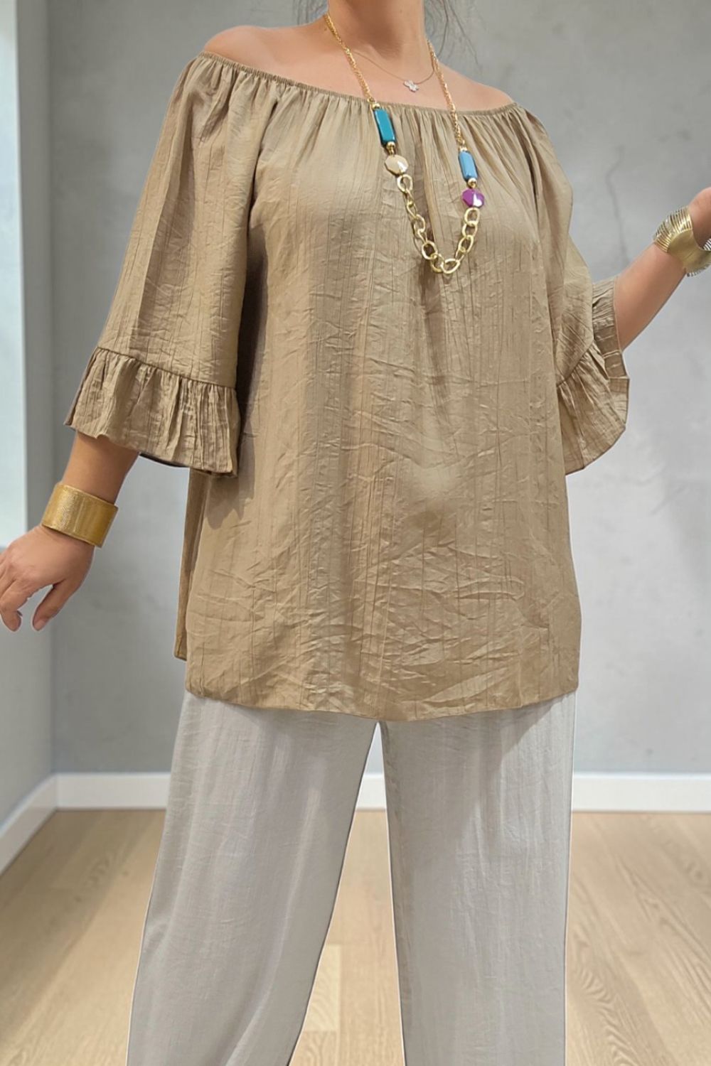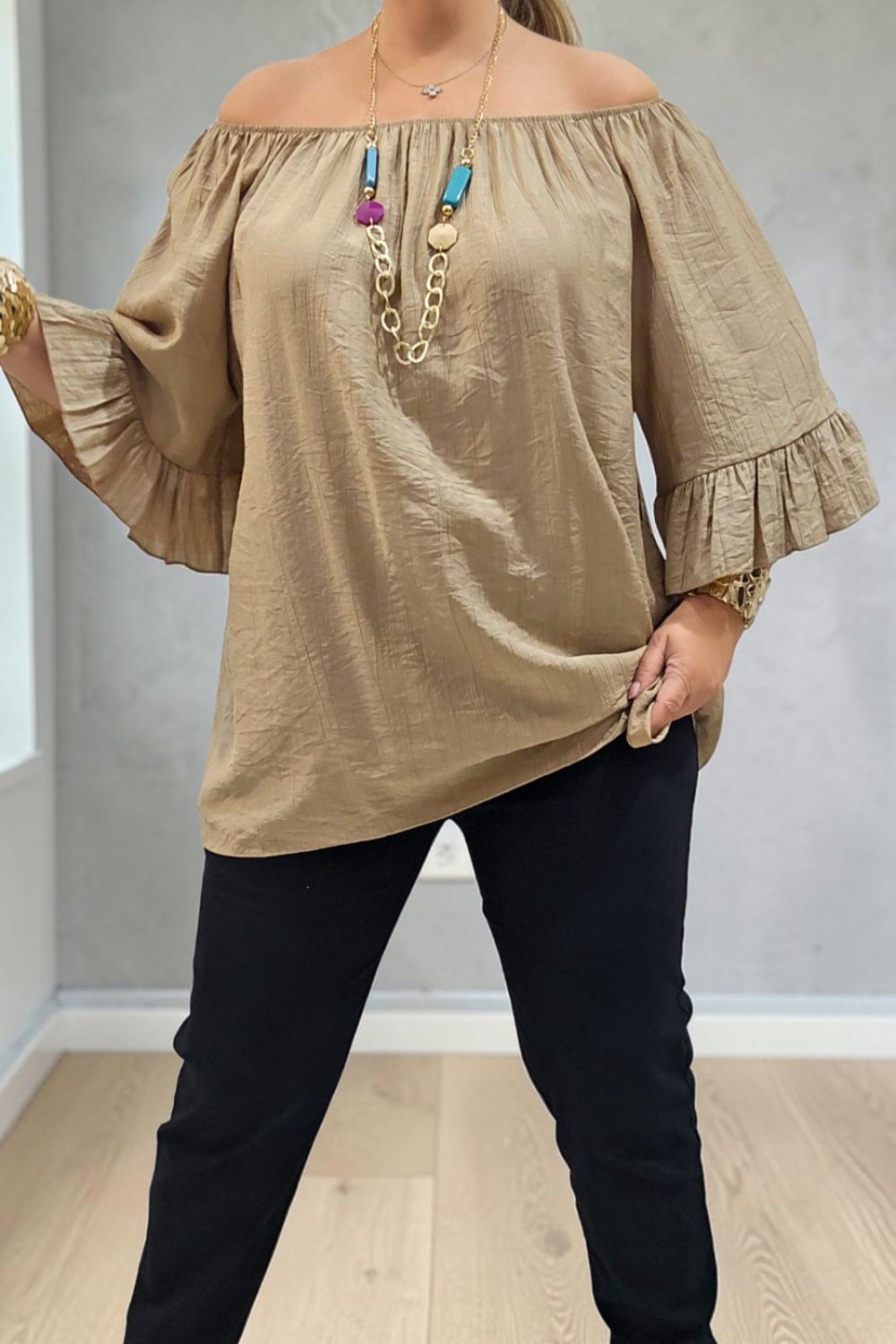 ΥΠΕΡΟΧΗ ΜΠΛΟΥΖΑ ΣΕ ΧΑΛΑΡΗ ΑΕΡΙΝΗ ΓΡΑΜΜΗ, ΜΕ ΛΑΙΜΟΚΟΨΗ ΤΥΠΟΥ BARDOT ΠΟΥ ΑΝΑΔΥΚΝΥΕΙ ΤΟΥΣ ΕΛΕΥΘΕΡΟΥΣ ΩΜΟΥΣ.ΔΙΑΘΕΤΕΙ ΕΛΑΣΤΙΚΟ ΤΕΛΕΙΩΜΑ ΣΤΟ ΠΑΝΩ ΜΕΡΟΣ ΓΙΑ ΣΤΑΘΕΡΗ ΕΦΕΡΜΟΓΗ ΚΑΙ ΕΝΤΥΠΩΣΙΑΚΑ ΤΡΙΑ ΤΕΤΑΡΤΑ ΜΑΝΙΚΙΑ ΜΕ ΒΟΛΑΝ ΠΟΥ ΧΑΡΙΖΟΥΝ ΚΙΝΗΣΗ ΚΑΙ ΡΟΜΑΝΤΙΚΟ ΥΦΟΣ.ΚΑΤΑΣΚΕΥΑΣΜΕΝΗ ΑΠΟ ΕΛΑΦΡΥ,ΔΡΟΣΕΡΟ ΥΦΑΣΜΑ ΜΕ ΑΠΑΛΗ ΥΦΗ ΓΙΑ ΑΙΣΘΗΣΗ ΑΠΑΛΟΤΗΤΑΣ.ΤΟ LOOK ΟΛΟΚΛΗΡΩΝΕΤΑΙ ΜΕ ΤΟ ΕΝΤΥΠΩΣΙΑΚΟ ΚΟΛΙΕ ΠΟΥ ΣΥΝΟΔΕΥΕΙ ΤΗΝ ΜΠΛΟΥΖΑ.ΙΔΑΝΙΚΗ ΓΙΑ CASUAL CHIC ΕΜΦΑΝΙΣΕΙΣ ΚΑΘ ΟΛΗ ΤΗ ΔΙΑΡΚΕΙΑ ΤΗΣ ΜΕΡΑΣ.ΣΥΝΘΕΣΗ 95% VISCOSE 5% ELASTIN.
