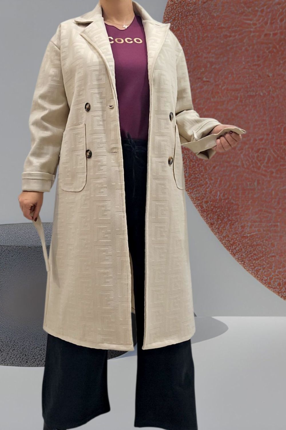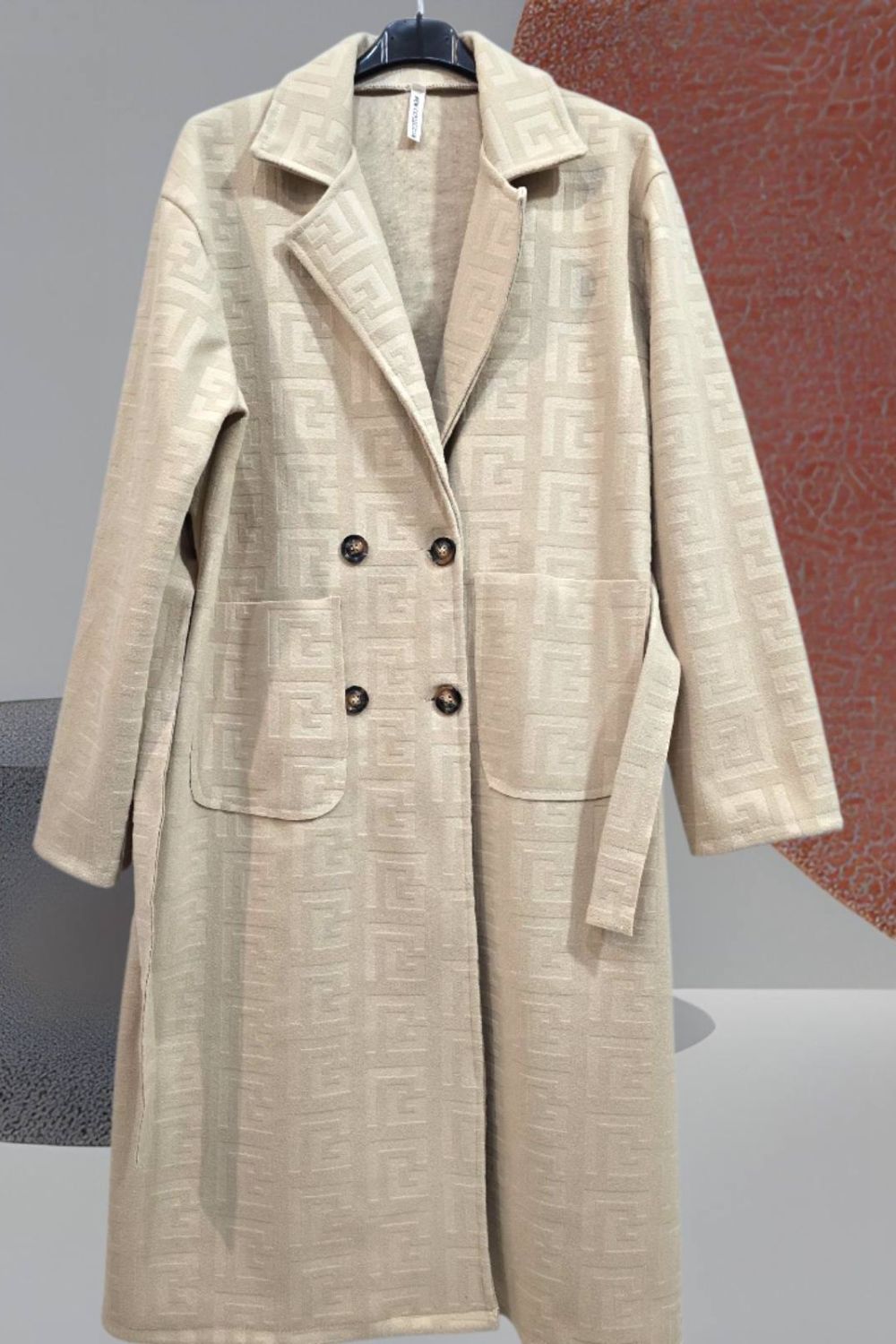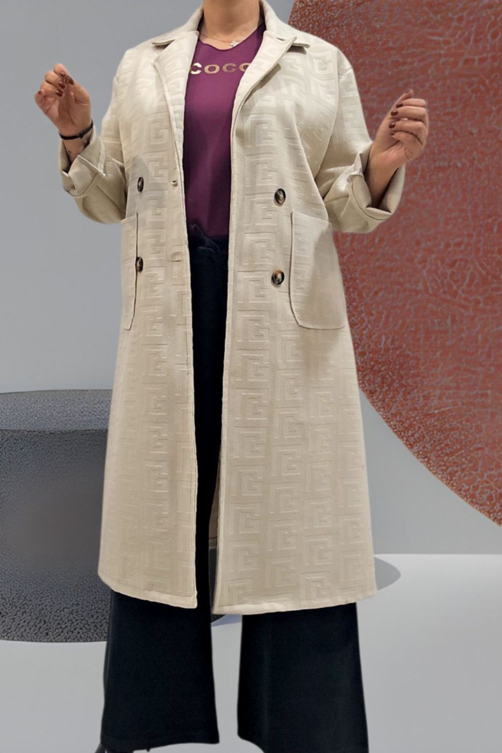 ΕΥΚΟΛΟΦΟΡΕΤΟ ΜΑΚΡΥ ΠΑΛΤΟ ΣΕ ΜΠΕΖ ΑΝΟΙΧΤΟ ΑΠΟΧΡΩΣΗ.ΤΟ ΥΦΑΣΜΑ ΕΧΕΙ ΕΠΑΝΑΛΑΜΒΟΜΕΝΟ ΓΕΩΜΕΤΡΙΚΟ ΣΧΕΔΙΟ.ΤΟ ΠΑΛΤΟ ΔΙΑΘΕΤΕΙ ΓΙΑΚΑ ΚΑΙ ΠΕΤΟ,ΔΥΟ ΜΕΓΑΛΕΣ ΤΣΕΠΕΣ ΚΑΙ ΔΙΠΛΗ ΣΕΙΡΑ ΑΠΟ ΚΟΥΜΠΙΑ .ΣΤΗΝ ΜΕΣΗ ΕΧΕΙ ΖΩΝΗ ΑΠΟ ΤΟ ΙΔΙΟ ΥΦΑΣΜΑ .ΤΟ ΣΤΥΛ ΤΟΥ ΕΙΝΑΙ ΚΟΜΨΟ ΚΑΤΑΛΛΗΛΟ ΓΙΑ ΦΘΙΝΟΠΩΡΙΝΕΣ ΚΑΙ ΧΕΙΜΕΡΙΝΕΣ ΕΜΦΑΝΙΣΕΙΣ.