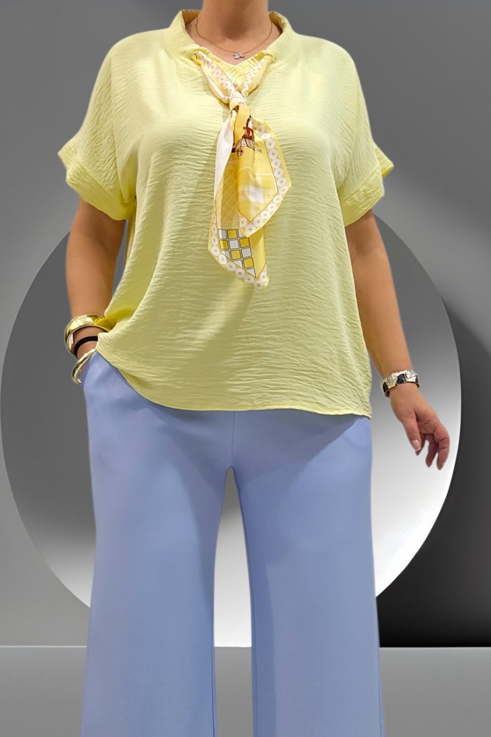 ΣΙΚΑΤΟ ΜΠΛΟΥΖΟ-ΠΟΥΚΑΜΙΣΟ ΣΧΕΔΙΑΣΜΕΝΟ ΓΙΑ ΔΙΑΧΡΟΝΙΚΕΣ ΚΑΙ ΠΡΟΣΕΓΜΕΝΕΣ ΕΜΦΑΝΙΣΕΙΣ . ΔΙΑΘΕΤΕΙ V ΛΑΙΜΟΚΟΨΗ ΕΝΩ ΤΟ ΦΟΥΛΑΡΙ ΣΤΟ ΛΑΙΜΟ ΛΕΙΤΟΥΡΓΕΙ ΣΑΝ ΚΟΜΨΟ ΚΟΣΜΗΜΑ ΔΙΝΟΝΤΑΣ ΜΙΑ ΠΙΝΕΛΙΑ ΣΤΙΛΙΣΤΙΚΗΣ ΑΡΜΟΝΙΑΣ . ΚΑΤΑΣΚΕΥΑΣΜΕΝΟ ΑΠΟ ΑΕΡΙΝΟ ΥΦΑΣΜΑ ΠΟΥ ΑΠΟΠΝΕΕΙ ΚΟΜΨΟΤΗΤΑ ΚΑΙ ΑΝΕΣΗ ΠΟΥ ΤΟ ΚΑΘΙΣΤΑ ΙΔΑΝΙΚΗ ΕΠΙΛΟΓΗ ΓΙΑ ΟΛΕΣ ΤΙΣ ΕΜΦΑΝΙΣΕΙΣ . ΣΥΝΘΕΣΗ 55% POLYESTER 40% VISCOSE 5% ELASTIN