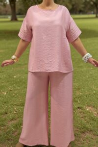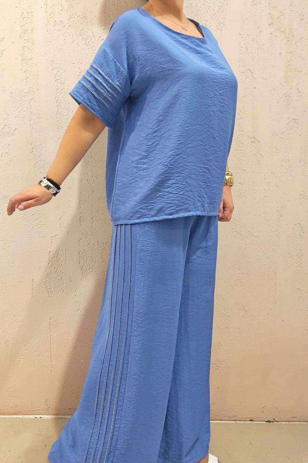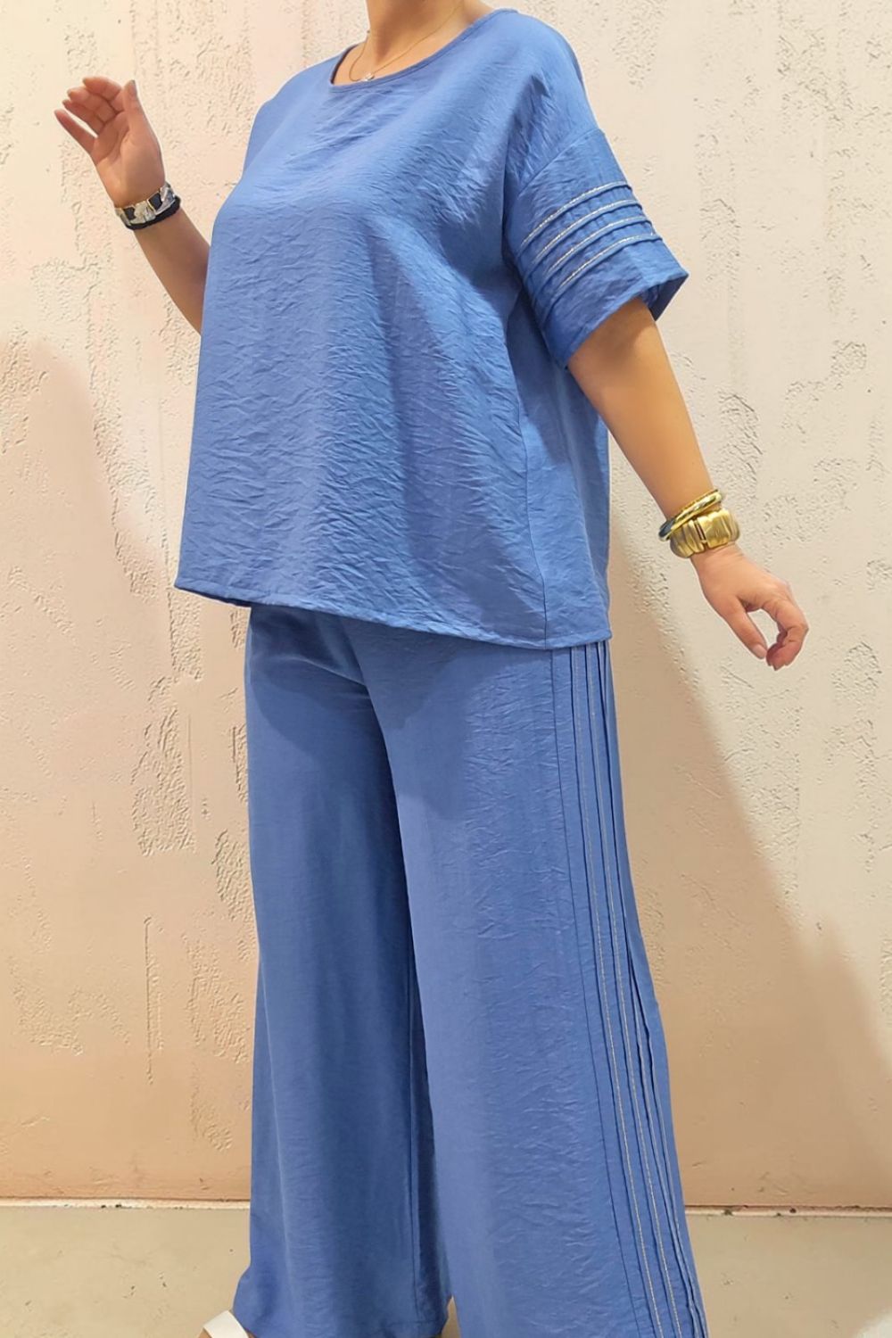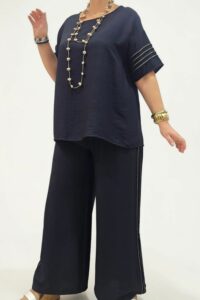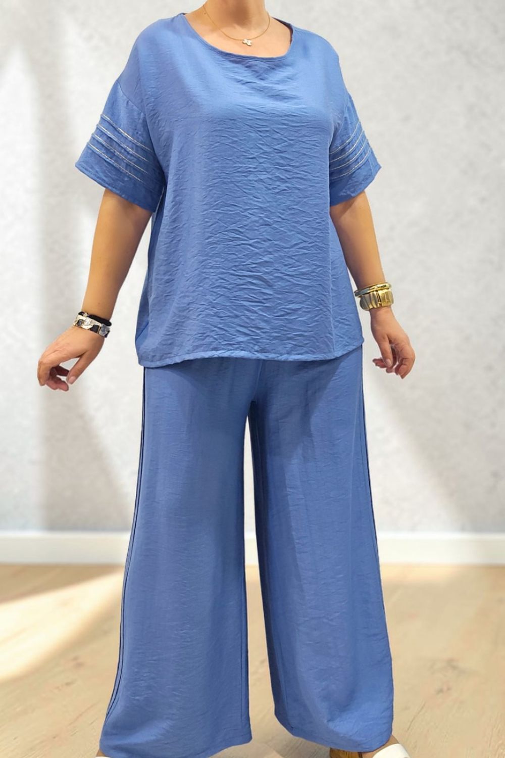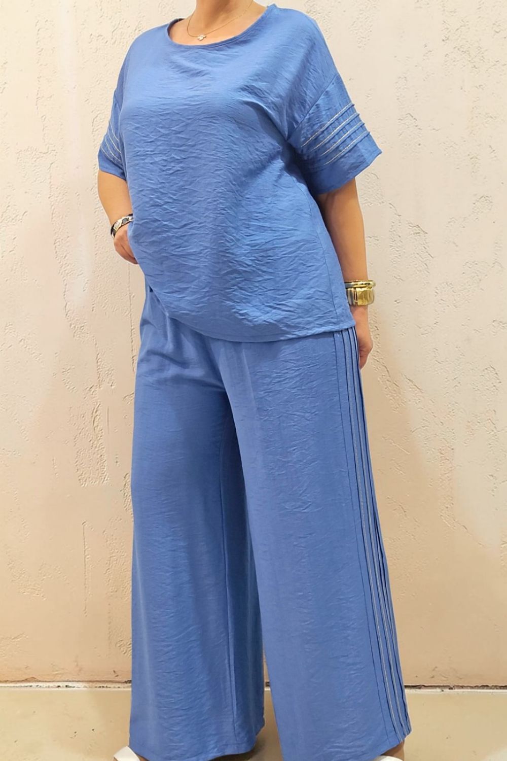 ΚΟΜΨΟ ΣΕΤ ΠΟΥ ΣΥΝΔΥΑΖΕΙ ΑΝΕΣΗ ΚΑΙ ΔΙΑΚΡΙΤΙΚΗ ΛΑΜΨΗ.Η ΜΠΛΟΥΖΑ ΔΙΑΘΕΤΕΙ ΧΑΛΑΡΗ ΓΡΑΜΜΗ ΚΑΙ ΚΟΝΤΟ ΜΑΝΙΚΙ ΔΙΑΚΟΣΜΗΜΕΝΟ ΜΕ ΧΡΥΣΑΦΙ ΣΙΡΙΤΙ ΠΟΥ ΠΡΟΣΘΕΤΕΙ ΜΙΑ ΕΚΛΕΠΤΥΣΜΕΝΗ ΠΙΝΕΛΙΑ ΠΟΛΥΤΕΛΕΙΑΣ.ΚΑΛΥΠΤΕΙ ΕΩΣ 124CM ΣΤΗΘΟΣ, ΕΩΣ 138CM ΠΕΡΙΦΕΡΕΙΑ ΚΑΙ 69CM ΜΗΚΟΣ.Η ΠΑΝΤΕΛΟΝΑ ΠΟΥ ΟΛΟΚΛΗΡΩΝΕΙ ΤΟ ΣΥΝΟΛΟ ,ΧΑΡΑΚΡΗΡΙΖΕΤΑΙ ΑΠΟ ΑΝΕΤΗ ΕΦΑΡΜΟΓΗ ΓΙΑ ΕΛΕΥΘΕΡΙΑ ΚΙΝΗΣΕΩΝ,ΚΑΙ ΚΑΘΕΤΕΣ ΕΝΤΥΠΩΣΙΑΚΕΣ ΧΡΥΣΑΦΙ ΛΕΠΤΟΜΕΡΕΙΕΣ,ΧΑΡΙΖΟΝΤΑΣ ΚΟΜΨΟ ΦΙΝΙΡΙΣΜΑ.ΚΑΛΥΠΤΕΙ ΕΩΣ 128CM ΜΕΣΗ ΚΑΙ ΕΩΣ 150CM ΠΕΡΙΦΕΡΕΙΑ.ΙΔΑΝΙΚΟ ΣΥΝΟΛΟ ΓΙΑ ΕΜΦΑΝΙΣΕΙΣ ΠΟΥ ΞΕΧΩΡΙΖΟΥΝ. ΣΥΝΘΕΣΗ 65% VISCOSE 30% POLYESTER 5% ELASTIN