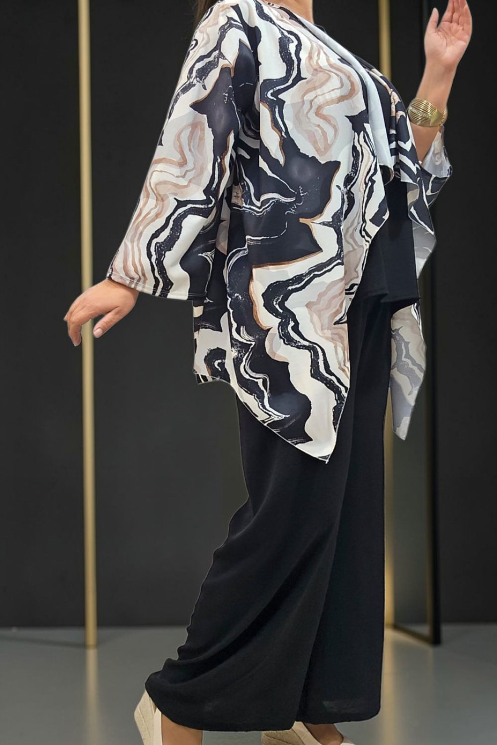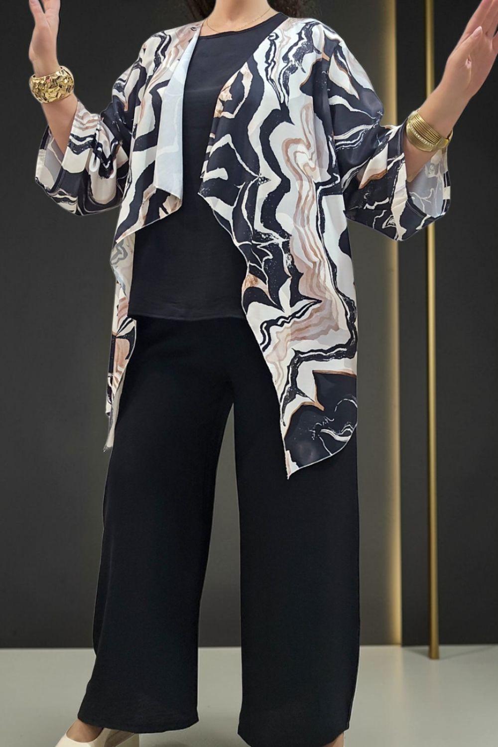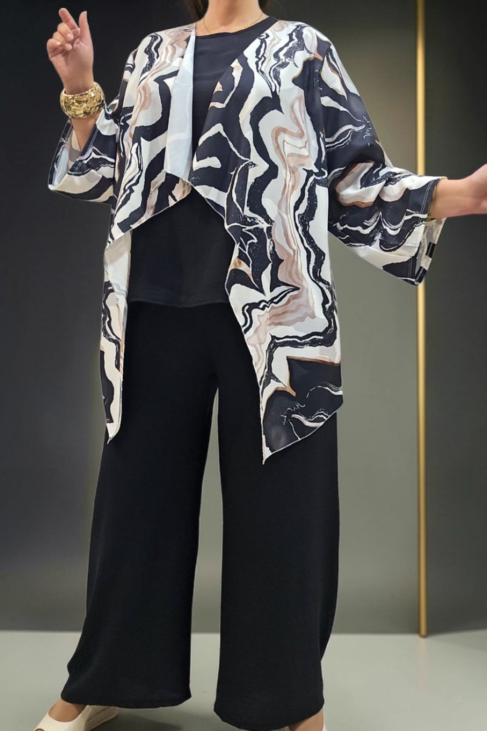 ΑΝΑΝΕΩΣΤΕ ΤΟ ΣΤΥΛ ΣΑΣ ΜΕ ΕΝΑ ΕΝΤΥΠΩΣΙΑΚΟ ΣΕΤ ΤΡΙΩΝ ΤΕΜΑΧΙΩΝ ΠΟΥ ΧΑΡΙΖΕΙ ΚΟΜΨΟΤΗΤΑ ,ΑΝΕΣΗ ΚΑΙ ΣΤΥΛ.ΑΠΟΤΕΛΕΙΤΑΙ ΑΠΟ ΚΑΖΑΚΑ-ΖΑΚΕΤΑ ΜΕ ΑΕΡΙΝΑ ΜΑΝΙΚΙΑ ΣΕ ΤΡΙΑ ΤΕΤΑΡΤΑ ΜΗΚΟΣ,ΠΟΥ ΠΡΟΣΔΙΔΟΥΝ ΚΙΝΗΣΗ ΚΑΙ ΦΙΝΕΤΣΑ.ΤΟ ΙΔΙΑΙΤΕΡΟ, ΑΦΗΡΗΜΕΝΟ ΜΟΤΙΒΟ ΤΗΣ, ΑΝΑΔΥΚΝΥΕΙ ΔΥΝΑΜΙΣΜΟ.ΚΑΛΥΠΤΕΙ ΣΤΗΘΟΣ ΕΩΣ 134CM ΚΑΙ ΠΕΡΙΦΕΡΕΙΑ ΕΩΣ 150CM.ΜΗΚΟΣ ΠΙΣΩ 70CM ΚΑΙ ΠΛΆΙΝΕΣ ΜΥΤΕΣ 91CM.ΤΟ ΜΠΛΟΥΖΑΚΙ ΕΣΩΤΕΡΙΚΑ , ΑΠΟΤΕΛΕΙ ΕΥΚΟΛΟΦΟΡΕΤΗ,ΟΥΔΕΤΕΡΗ ΒΑΣΗ.ΚΑΛΥΠΤΕΙ ΕΩΣ 136CM ΣΤΗΘΟΣ ΚΑΙ ΕΩΣ 144CM ΠΕΡΙΦΕΡΕΙΑ.Η ΠΑΝΤΕΛΟΝΑ ΣΕ ΑΝΕΤΗ ΚΑΙ ΧΑΛΑΡΗ ΓΡΑΜΜΗ,ΕΧΕΙ ΛΑΣΤΙΧΟ ΣΤΗΝ ΜΕΣΗ ΓΙΑ ΕΥΕΛΙΞΙΑ ΚΑΙ ΣΤΑΘΕΡΟΤΗΤΑ .ΚΑΛΥΠΤΕΙ ΜΕΣΗ ΕΩΣ 130CM ΚΑΙ ΠΕΡΙΦΕΡΕΙΑ ΕΩΣ 138CM..ΕΝΑ ΕΞΥΠΝΟ ΣΕΤ ΠΟΥ ΜΠΟΡΕΙ ΝΑ ΦΟΡΕΘΕΙ ΚΑΙ ΜΕΜΟΝΩΜΕΝΑ,ΜΕ ΟΤΙ ΑΛΛΟ ΕΠΙΘΥΜΕΙΤΕ ΝΑ ΤΟ ΣΥΝΔΥΑΣΕΤΕ.ΜΙΑ ΜΟΝΤΕΡΝΑ ΕΠΙΛΟΓΗ ΠΟΥ ΔΗΜΙΟΥΡΓΕΙ ΚΟΜΨΑ LOOKS ΜΕ ΜΙΑ ΚΙΝΗΣΗ.ΣΥΝΘΕΣΗ 55% POLYESTER 45% VISCOSE 5% ELASTICO
