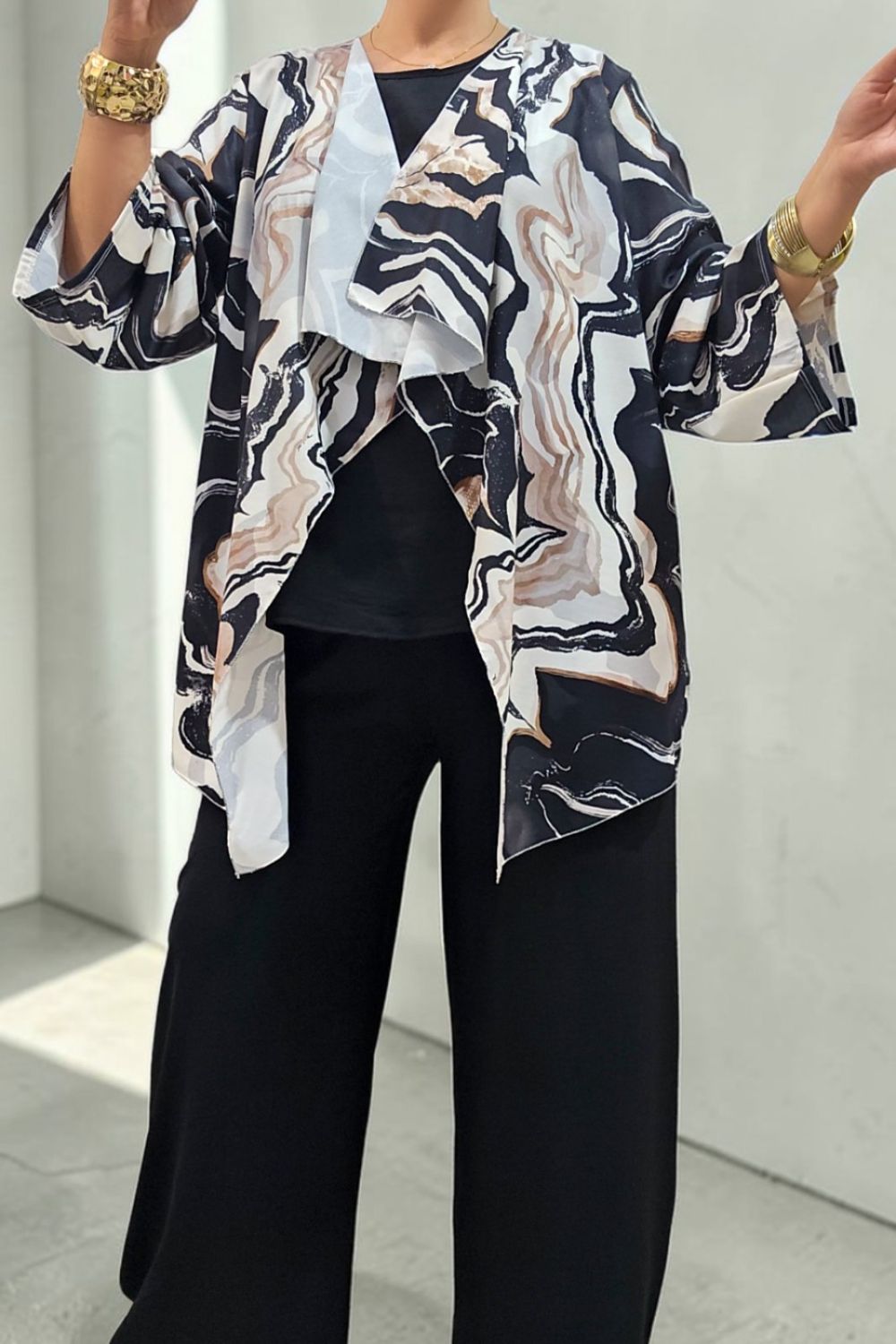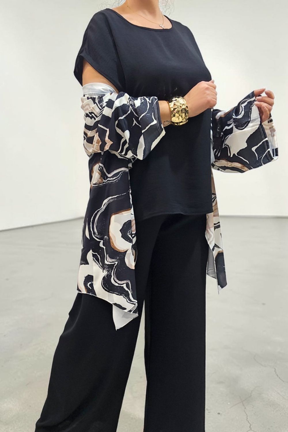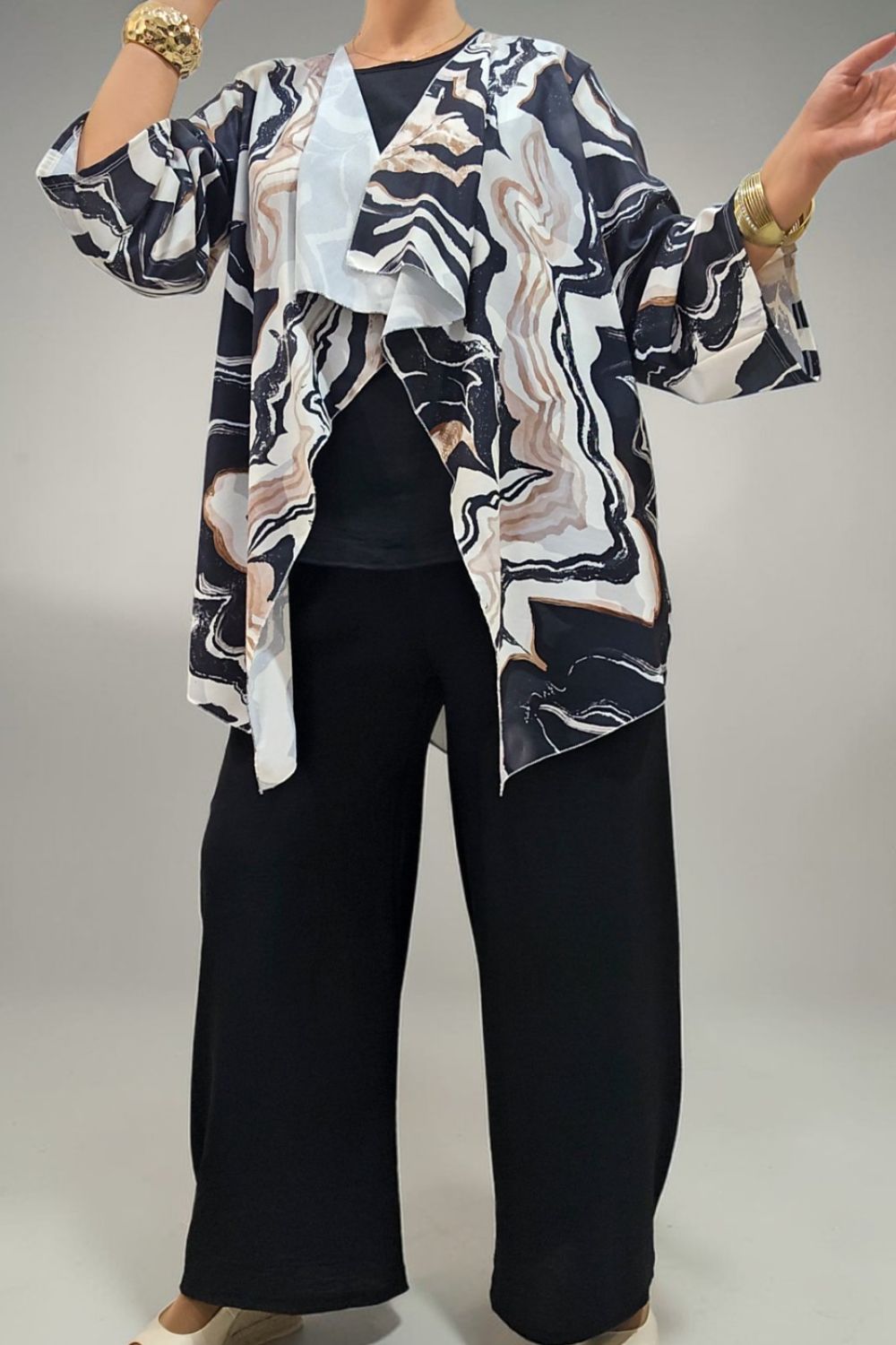 ΑΝΑΝΕΩΣΤΕ ΤΟ ΣΤΥΛ ΣΑΣ ΜΕ ΕΝΑ ΕΝΤΥΠΩΣΙΑΚΟ ΣΕΤ ΤΡΙΩΝ ΤΕΜΑΧΙΩΝ ΠΟΥ ΧΑΡΙΖΕΙ ΚΟΜΨΟΤΗΤΑ ,ΑΝΕΣΗ ΚΑΙ ΣΤΥΛ.ΑΠΟΤΕΛΕΙΤΑΙ ΑΠΟ ΚΑΖΑΚΑ-ΖΑΚΕΤΑ ΜΕ ΑΕΡΙΝΑ ΜΑΝΙΚΙΑ ΣΕ ΤΡΙΑ ΤΕΤΑΡΤΑ ΜΗΚΟΣ,ΠΟΥ ΠΡΟΣΔΙΔΟΥΝ ΚΙΝΗΣΗ ΚΑΙ ΦΙΝΕΤΣΑ.ΤΟ ΙΔΙΑΙΤΕΡΟ, ΑΦΗΡΗΜΕΝΟ ΜΟΤΙΒΟ ΤΗΣ, ΑΝΑΔΥΚΝΥΕΙ ΔΥΝΑΜΙΣΜΟ.ΚΑΛΥΠΤΕΙ ΣΤΗΘΟΣ ΕΩΣ 134CM ΚΑΙ ΠΕΡΙΦΕΡΕΙΑ ΕΩΣ 150CM.ΜΗΚΟΣ ΠΙΣΩ 70CM ΚΑΙ ΠΛΆΙΝΕΣ ΜΥΤΕΣ 91CM.ΤΟ ΜΠΛΟΥΖΑΚΙ ΕΣΩΤΕΡΙΚΑ , ΑΠΟΤΕΛΕΙ ΕΥΚΟΛΟΦΟΡΕΤΗ,ΟΥΔΕΤΕΡΗ ΒΑΣΗ.ΚΑΛΥΠΤΕΙ ΕΩΣ 136CM ΣΤΗΘΟΣ ΚΑΙ ΕΩΣ 144CM ΠΕΡΙΦΕΡΕΙΑ.Η ΠΑΝΤΕΛΟΝΑ ΣΕ ΑΝΕΤΗ ΚΑΙ ΧΑΛΑΡΗ ΓΡΑΜΜΗ,ΕΧΕΙ ΛΑΣΤΙΧΟ ΣΤΗΝ ΜΕΣΗ ΓΙΑ ΕΥΕΛΙΞΙΑ ΚΑΙ ΣΤΑΘΕΡΟΤΗΤΑ .ΚΑΛΥΠΤΕΙ ΜΕΣΗ ΕΩΣ 130CM ΚΑΙ ΠΕΡΙΦΕΡΕΙΑ ΕΩΣ 138CM..ΕΝΑ ΕΞΥΠΝΟ ΣΕΤ ΠΟΥ ΜΠΟΡΕΙ ΝΑ ΦΟΡΕΘΕΙ ΚΑΙ ΜΕΜΟΝΩΜΕΝΑ,ΜΕ ΟΤΙ ΑΛΛΟ ΕΠΙΘΥΜΕΙΤΕ ΝΑ ΤΟ ΣΥΝΔΥΑΣΕΤΕ.ΜΙΑ ΜΟΝΤΕΡΝΑ ΕΠΙΛΟΓΗ ΠΟΥ ΔΗΜΙΟΥΡΓΕΙ ΚΟΜΨΑ LOOKS ΜΕ ΜΙΑ ΚΙΝΗΣΗ.ΣΥΝΘΕΣΗ 55% POLYESTER 45% VISCOSE 5% ELASTICO