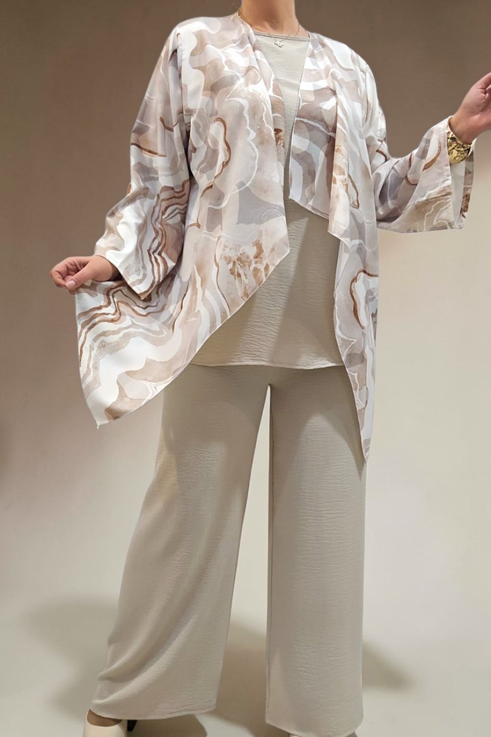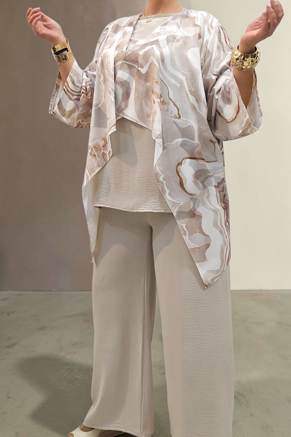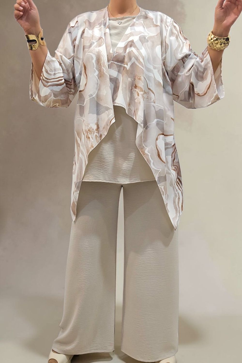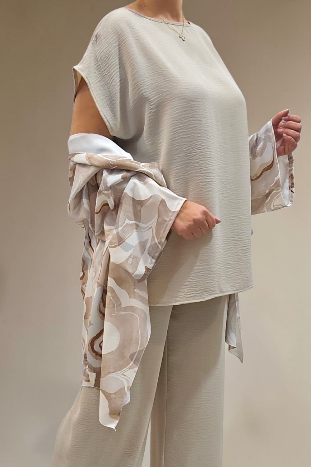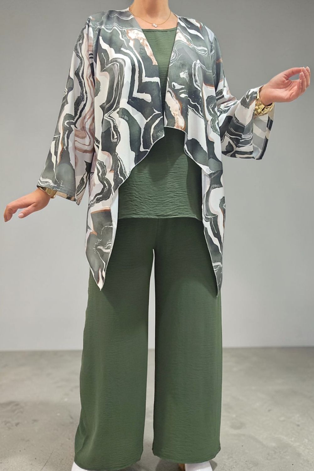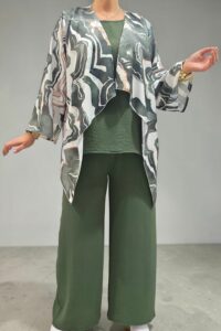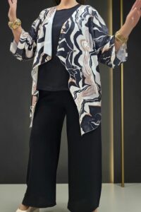 ΑΝΑΝΕΩΣΤΕ ΤΟ ΣΤΥΛ ΣΑΣ ΜΕ ΕΝΑ ΕΝΤΥΠΩΣΙΑΚΟ ΣΕΤ ΤΡΙΩΝ ΤΕΜΑΧΙΩΝ ΠΟΥ ΧΑΡΙΖΕΙ ΚΟΜΨΟΤΗΤΑ ,ΑΝΕΣΗ ΚΑΙ ΣΤΥΛ.ΑΠΟΤΕΛΕΙΤΑΙ ΑΠΟ ΚΑΖΑΚΑ-ΖΑΚΕΤΑ ΜΕ ΑΕΡΙΝΑ ΜΑΝΙΚΙΑ ΣΕ ΤΡΙΑ ΤΕΤΑΡΤΑ ΜΗΚΟΣ,ΠΟΥ ΠΡΟΣΔΙΔΟΥΝ ΚΙΝΗΣΗ ΚΑΙ ΦΙΝΕΤΣΑ.ΤΟ ΙΔΙΑΙΤΕΡΟ, ΑΦΗΡΗΜΕΝΟ ΜΟΤΙΒΟ ΤΗΣ, ΑΝΑΔΥΚΝΥΕΙ ΔΥΝΑΜΙΣΜΟ.ΚΑΛΥΠΤΕΙ ΣΤΗΘΟΣ ΕΩΣ 134CM ΚΑΙ ΠΕΡΙΦΕΡΕΙΑ ΕΩΣ 150CM.ΜΗΚΟΣ ΠΙΣΩ 70CM ΚΑΙ ΠΛΆΙΝΕΣ ΜΥΤΕΣ 91CM.ΤΟ ΜΠΛΟΥΖΑΚΙ ΕΣΩΤΕΡΙΚΑ , ΑΠΟΤΕΛΕΙ ΕΥΚΟΛΟΦΟΡΕΤΗ,ΟΥΔΕΤΕΡΗ ΒΑΣΗ.ΚΑΛΥΠΤΕΙ ΕΩΣ 136CM ΣΤΗΘΟΣ ΚΑΙ ΕΩΣ 144CM ΠΕΡΙΦΕΡΕΙΑ.Η ΠΑΝΤΕΛΟΝΑ ΣΕ ΑΝΕΤΗ ΚΑΙ ΧΑΛΑΡΗ ΓΡΑΜΜΗ,ΕΧΕΙ ΛΑΣΤΙΧΟ ΣΤΗΝ ΜΕΣΗ ΓΙΑ ΕΥΕΛΙΞΙΑ ΚΑΙ ΣΤΑΘΕΡΟΤΗΤΑ .ΚΑΛΥΠΤΕΙ ΜΕΣΗ ΕΩΣ 130CM ΚΑΙ ΠΕΡΙΦΕΡΕΙΑ ΕΩΣ 138CM..ΕΝΑ ΕΞΥΠΝΟ ΣΕΤ ΠΟΥ ΜΠΟΡΕΙ ΝΑ ΦΟΡΕΘΕΙ ΚΑΙ ΜΕΜΟΝΩΜΕΝΑ,ΜΕ ΟΤΙ ΑΛΛΟ ΕΠΙΘΥΜΕΙΤΕ ΝΑ ΤΟ ΣΥΝΔΥΑΣΕΤΕ.ΜΙΑ ΜΟΝΤΕΡΝΑ ΕΠΙΛΟΓΗ ΠΟΥ ΔΗΜΙΟΥΡΓΕΙ ΚΟΜΨΑ LOOKS ΜΕ ΜΙΑ ΚΙΝΗΣΗ.ΣΥΝΘΕΣΗ 55% POLYESTER 45% VISCOSE 5% ELASTIN