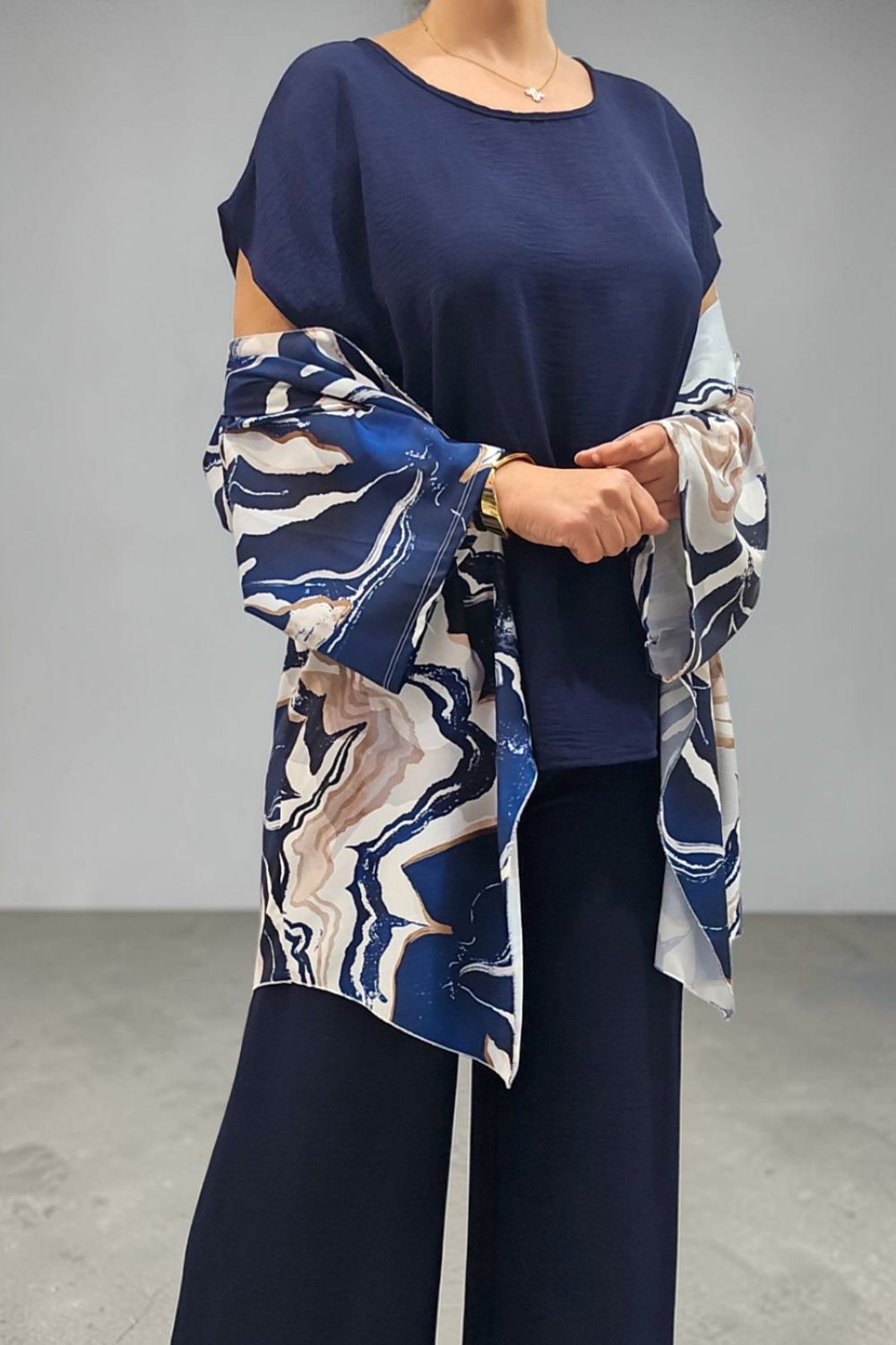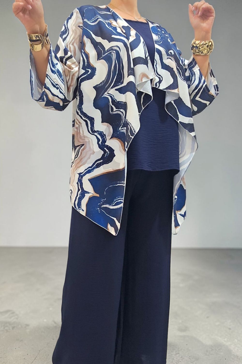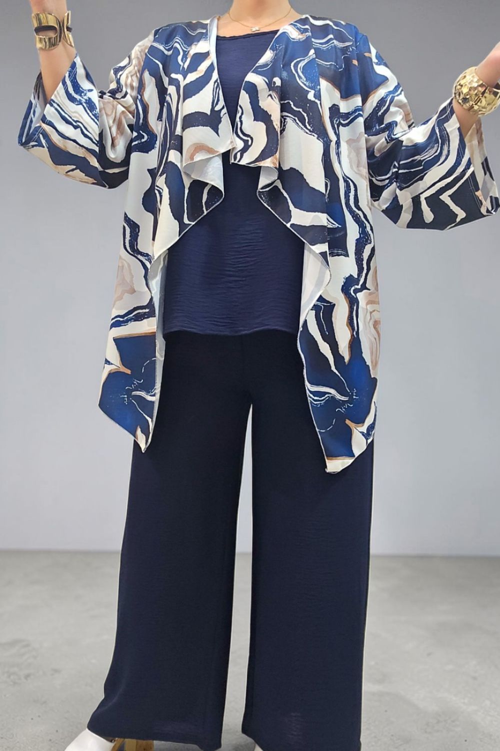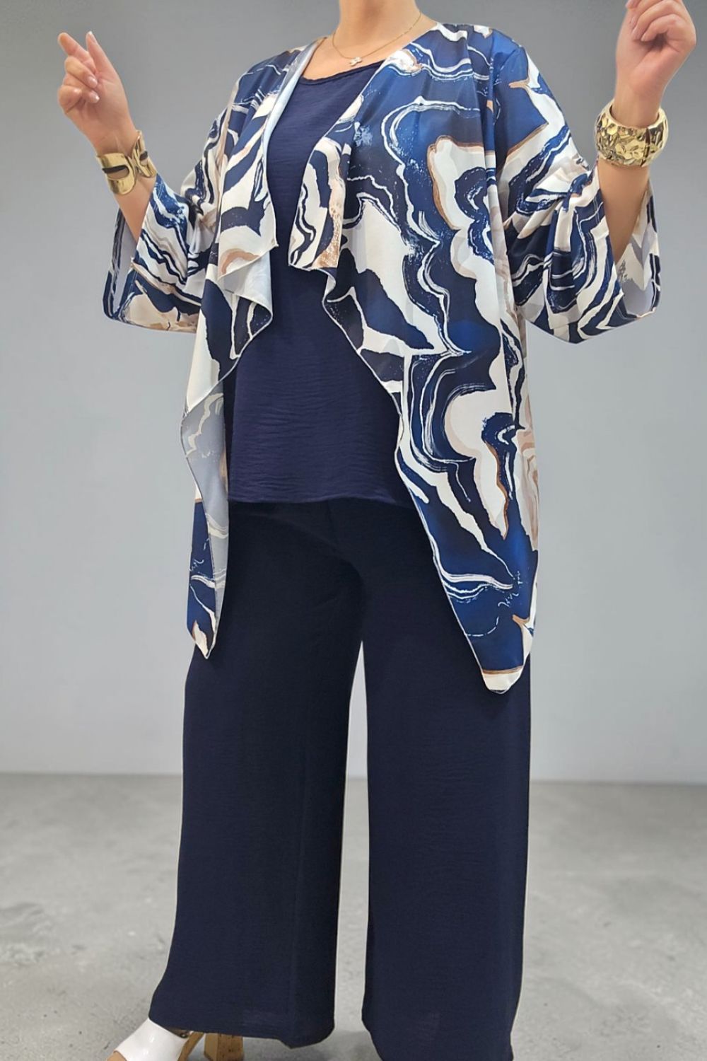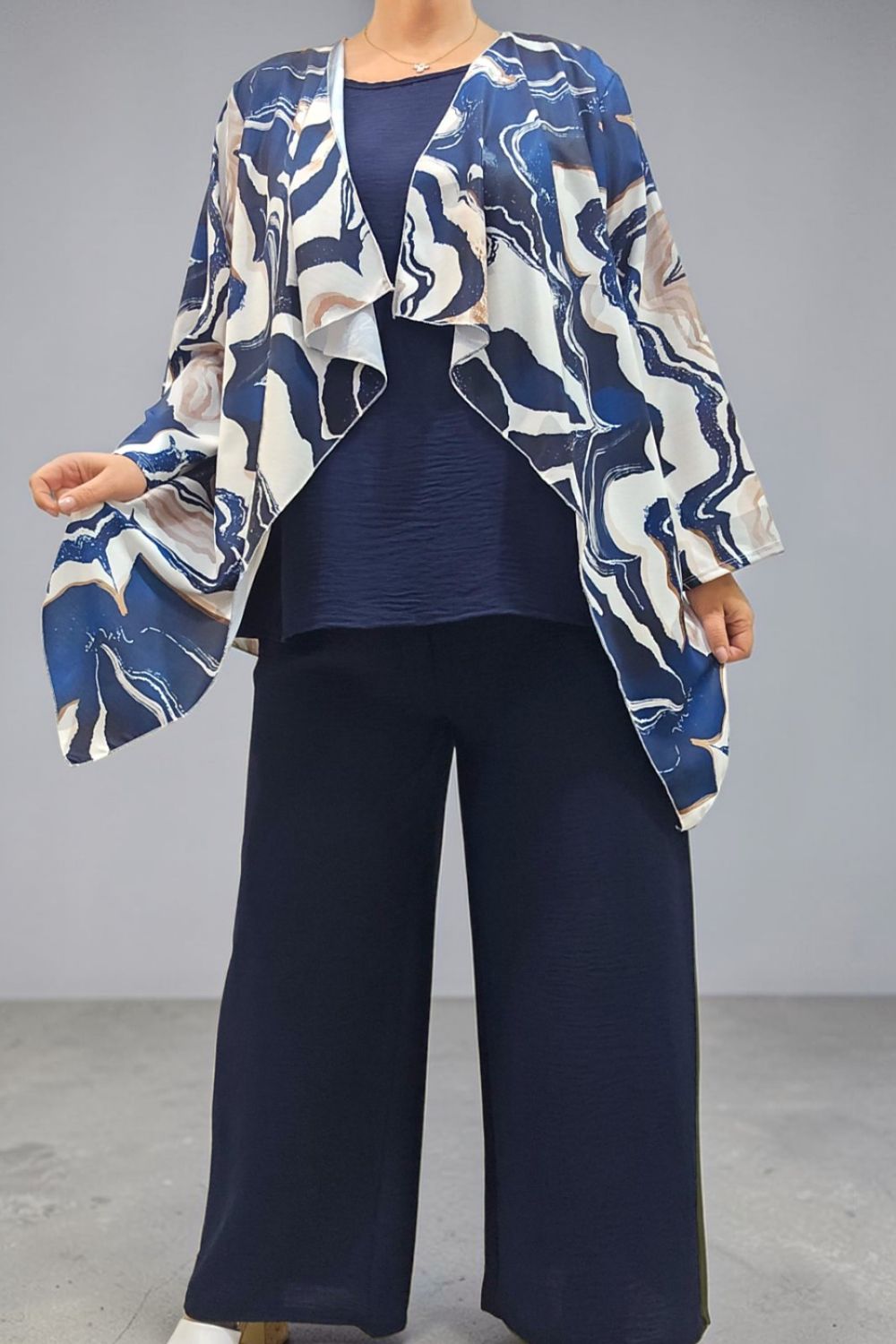 ΑΝΑΝΕΩΣΤΕ ΤΟ ΣΤΥΛ ΣΑΣ ΜΕ ΕΝΑ ΕΝΤΥΠΩΣΙΑΚΟ ΣΕΤ ΤΡΙΩΝ ΤΕΜΑΧΙΩΝ ΠΟΥ ΧΑΡΙΖΕΙ ΚΟΜΨΟΤΗΤΑ ,ΑΝΕΣΗ ΚΑΙ ΣΤΥΛ.ΑΠΟΤΕΛΕΙΤΑΙ ΑΠΟ ΚΑΖΑΚΑ-ΖΑΚΕΤΑ ΜΕ ΑΕΡΙΝΑ ΜΑΝΙΚΙΑ ΣΕ ΤΡΙΑ ΤΕΤΑΡΤΑ ΜΗΚΟΣ,ΠΟΥ ΠΡΟΣΔΙΔΟΥΝ ΚΙΝΗΣΗ ΚΑΙ ΦΙΝΕΤΣΑ.ΤΟ ΙΔΙΑΙΤΕΡΟ, ΑΦΗΡΗΜΕΝΟ ΜΟΤΙΒΟ ΤΗΣ, ΑΝΑΔΥΚΝΥΕΙ ΔΥΝΑΜΙΣΜΟ.ΚΑΛΥΠΤΕΙ ΣΤΗΘΟΣ ΕΩΣ 134CM ΚΑΙ ΠΕΡΙΦΕΡΕΙΑ ΕΩΣ 150CM.ΜΗΚΟΣ ΠΙΣΩ 70CM ΚΑΙ ΠΛΆΙΝΕΣ ΜΥΤΕΣ 91CM.ΤΟ ΜΠΛΟΥΖΑΚΙ ΕΣΩΤΕΡΙΚΑ , ΑΠΟΤΕΛΕΙ ΕΥΚΟΛΟΦΟΡΕΤΗ,ΟΥΔΕΤΕΡΗ ΒΑΣΗ.ΚΑΛΥΠΤΕΙ ΕΩΣ 136CM ΣΤΗΘΟΣ ΚΑΙ ΕΩΣ 144CM ΠΕΡΙΦΕΡΕΙΑ.Η ΠΑΝΤΕΛΟΝΑ ΣΕ ΑΝΕΤΗ ΚΑΙ ΧΑΛΑΡΗ ΓΡΑΜΜΗ,ΕΧΕΙ ΛΑΣΤΙΧΟ ΣΤΗΝ ΜΕΣΗ ΓΙΑ ΕΥΕΛΙΞΙΑ ΚΑΙ ΣΤΑΘΕΡΟΤΗΤΑ .ΚΑΛΥΠΤΕΙ ΜΕΣΗ ΕΩΣ 130CM ΚΑΙ ΠΕΡΙΦΕΡΕΙΑ ΕΩΣ 138CM..ΕΝΑ ΕΞΥΠΝΟ ΣΕΤ ΠΟΥ ΜΠΟΡΕΙ ΝΑ ΦΟΡΕΘΕΙ ΚΑΙ ΜΕΜΟΝΩΜΕΝΑ,ΜΕ ΟΤΙ ΑΛΛΟ ΕΠΙΘΥΜΕΙΤΕ ΝΑ ΤΟ ΣΥΝΔΥΑΣΕΤΕ.ΜΙΑ ΜΟΝΤΕΡΝΑ ΕΠΙΛΟΓΗ ΠΟΥ ΔΗΜΙΟΥΡΓΕΙ ΚΟΜΨΑ LOOKS ΜΕ ΜΙΑ ΚΙΝΗΣΗ.ΣΥΝΘΕΣΗ 55% POLYESTER 45% VISCOSE 5% ELASTIN