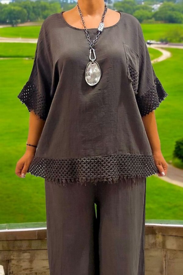 ΕΝΤΥΠΩΣΙΑΚΟ ΚΑΙ ΠΡΑΚΤΙΚΟ ΣΕΤ ΑΠΟ ΛΙΝΟ-ΒΑΜΒΑΚΕΡΟ ΥΦΑΣΜΑ,ΙΔΑΝΙΚΟ ΓΙΑ ΤΙΣ ΖΕΣΤΕΣ ΜΕΡΕΣ ΤΟΥ ΚΑΛΟΚΑΙΡΙΟΥ.Η ΜΠΛΟΥΖΑ ΞΕΧΩΡΙΖΕΙ ΜΕ ΤΟ ΜΟΝΤΕΡΝΟ ΤΣΕΠΑΚΙ ΣΤΟ ΠΑΝΩ ΑΡΙΣΤΕΡΟ ΜΕΡΟΣ,ΔΙΑΚΟΣΜΗΜΕΝΟ ΜΕ ΔΙΧΤΥ,ΠΟΥ ΕΠΑΝΑΛΑΜΒΑΝΕΤΑΙ ΑΡΜΟΝΙΚΑ ΣΤΟ ΤΕΛΕΙΩΜΑ ΤΗΣ ΜΠΛΟΥΖΑΣ ΚΑΙ ΣΤΑ ΜΑΝΙΚΙΑ,ΠΡΟΣΘΕΤΟΝΤΑΣ ΙΔΙΑΙΤΕΡΟ ΧΑΡΑΚΤΗΡΑ ΣΤΟ ΣΥΝΟΛΟ.Η ΜΠΛΟΥΖΑ ΚΑΛΥΠΤΕΙ ΣΤΗΘΟΣ ΕΩΣ 144CM ΚΑΙ ΠΕΡΙΦΕΡΕΙΑ ΕΩΣ 148CM,ΜΗΚΟΣ 70CM.ΣΥΝΟΔΕΥΕΤΑΙ ΑΠΟ ΑΝΕΤΗ ΠΑΝΤΕΛΟΝΑ ΜΕ ΛΑΣΤΙΧΟ ΣΤΗΝ ΜΕΣΗ ΓΙΑ ΤΕΛΕΙΑ ΕΦΑΡΜΟΓΗ ΚΑΙ ΑΝΕΣΗ ΟΛΗ ΜΕΡΑ.ΚΑΛΥΠΤΕΙ ΜΕΣΗ ΕΩΣ 130CM ΚΑΙ ΠΕΡΙΦΕΡΕΙΑ ΕΩΣ 152CM.ΣΥΝΘΕΣΗ 100% COTTON.