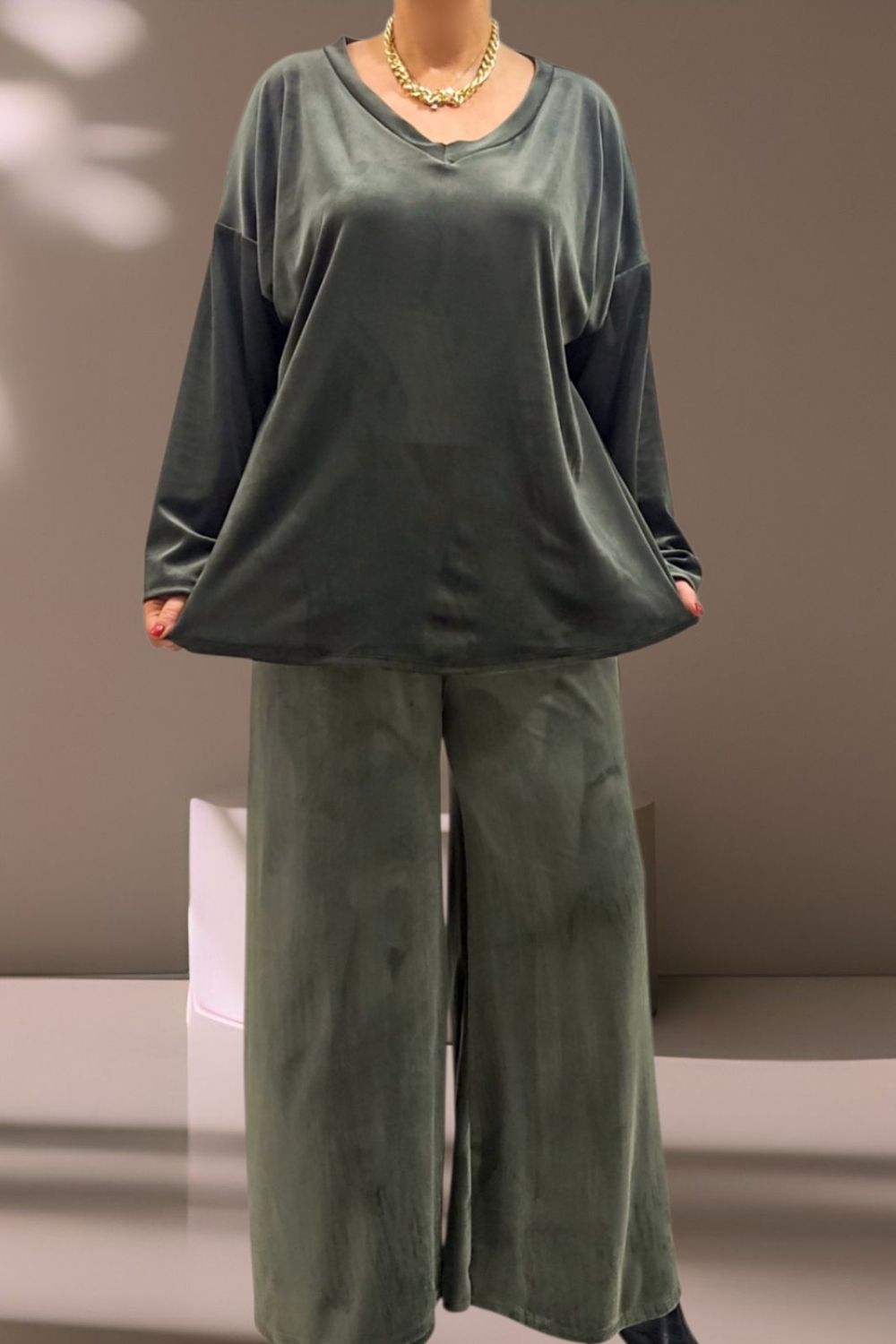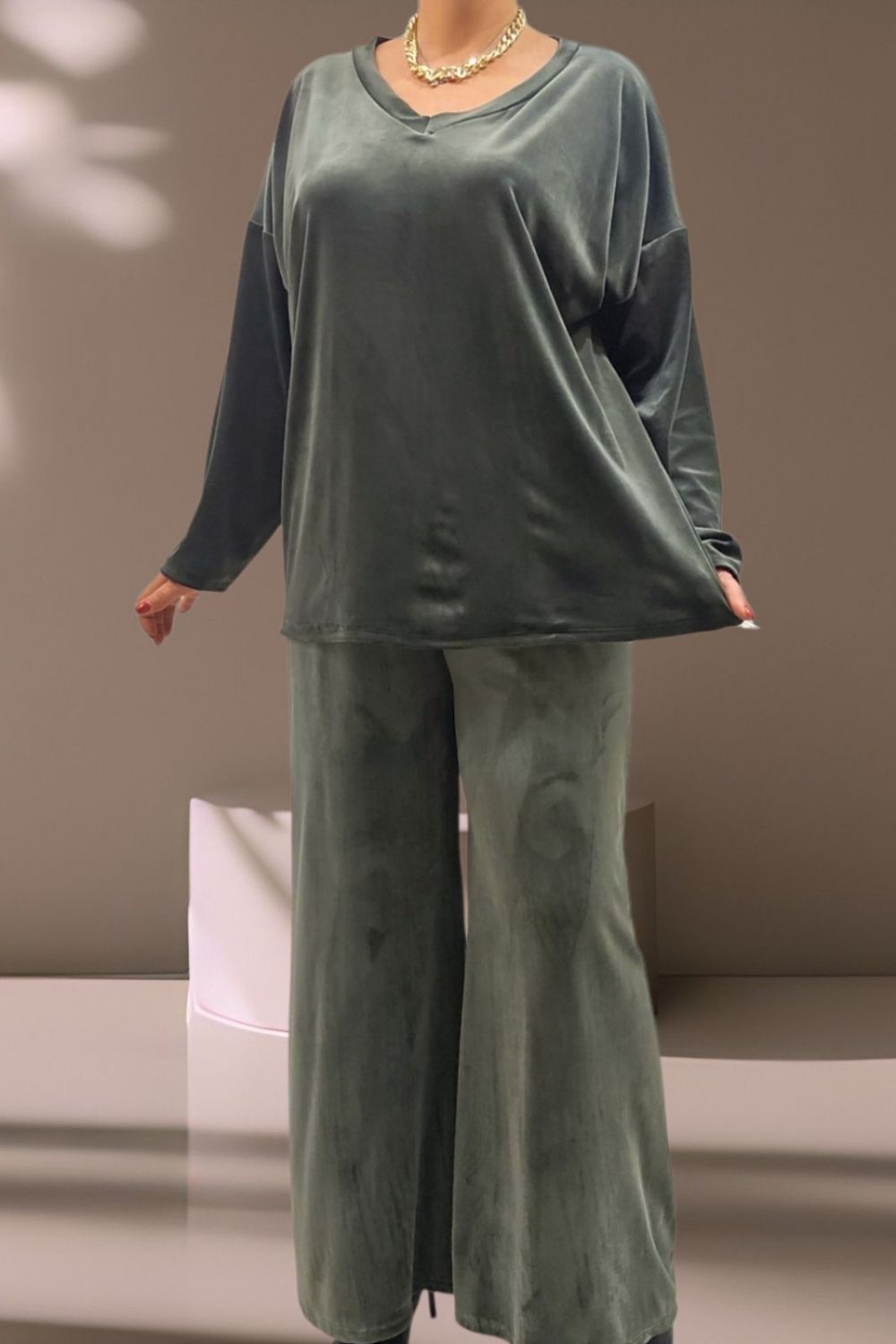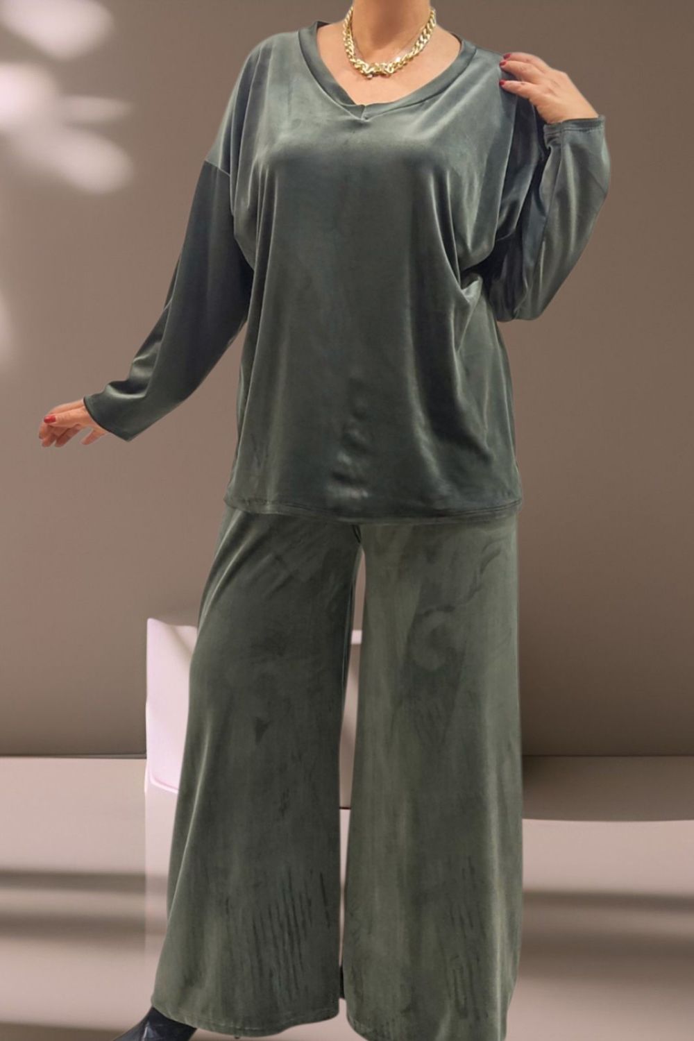 ΑΝΑΝΕΩΣΤΕ ΤΟ CASUAL LOOK ΣΑΣ ΜΕ ΑΥΤΟ ΤΟ PLUS SIZE ΒΕΛΟΥΔΙΝΟ ΣΕΤ ΠΟΥ ΣΥΝΔΥΑΖΕΙ ΑΝΕΣΗ ΚΑΙ ΚΟΜΨΟΤΗΤΑ.ΔΙΑΘΕΤΕΙ ΚΟΜΨΟ V ΑΝΟΙΓΜΑ ΜΠΡΟΣΤΑ ΚΑΙ ΚΑΛΥΠΤΕΙ ΣΤΗΘΟΣ ΕΩΣ 160CM ΚΑΙ ΠΕΡΙΦΕΡΕΙΑ ΕΩΣ 170CM.ΜΗΚΟΣ 73CM.Η ΠΑΝΤΕΛΟΝΑ ΜΕ ΛΑΣΤΙΧΟ ΣΤΗ ΜΕΣΗ ΠΡΟΣΦΕΡΕΙ ΑΝΕΤΗ ΚΑΙ ΤΕΛΕΙΑ ΕΦΑΡΜΟΓΗ.ΚΑΛΥΠΤΕΙ ΜΕΣΗ ΕΩΣ 150CM ΚΑΙ ΠΕΡΙΦΕΡΕΙΑ ΕΩΣ 158CM.ΙΔΑΝΙΚΟ ΓΙΑ ΟΛΕΣ ΤΙΣ ΩΡΕΣ