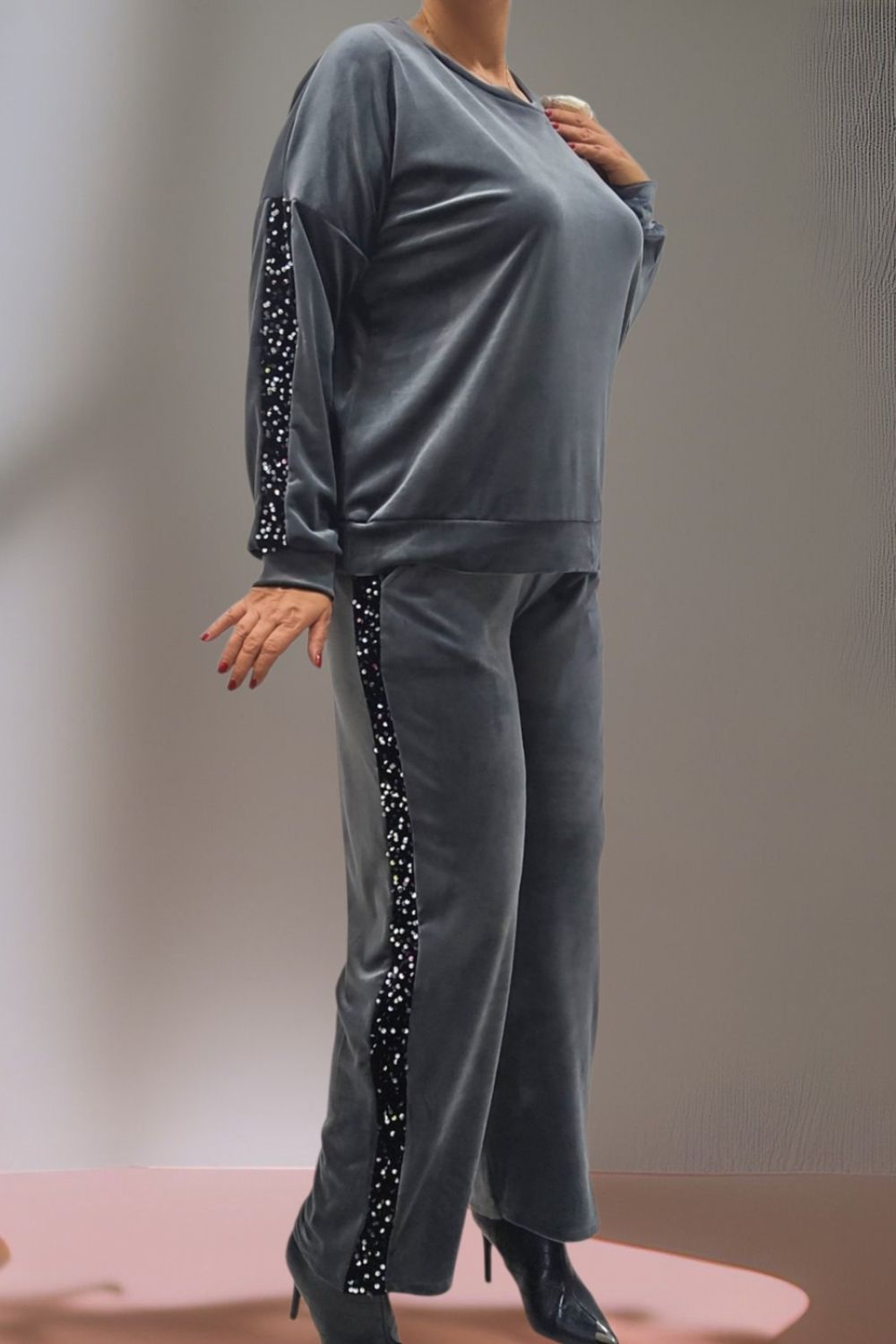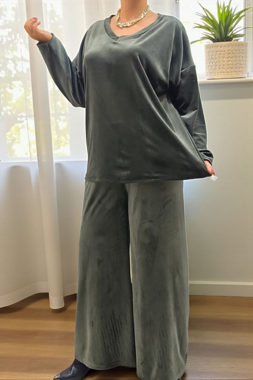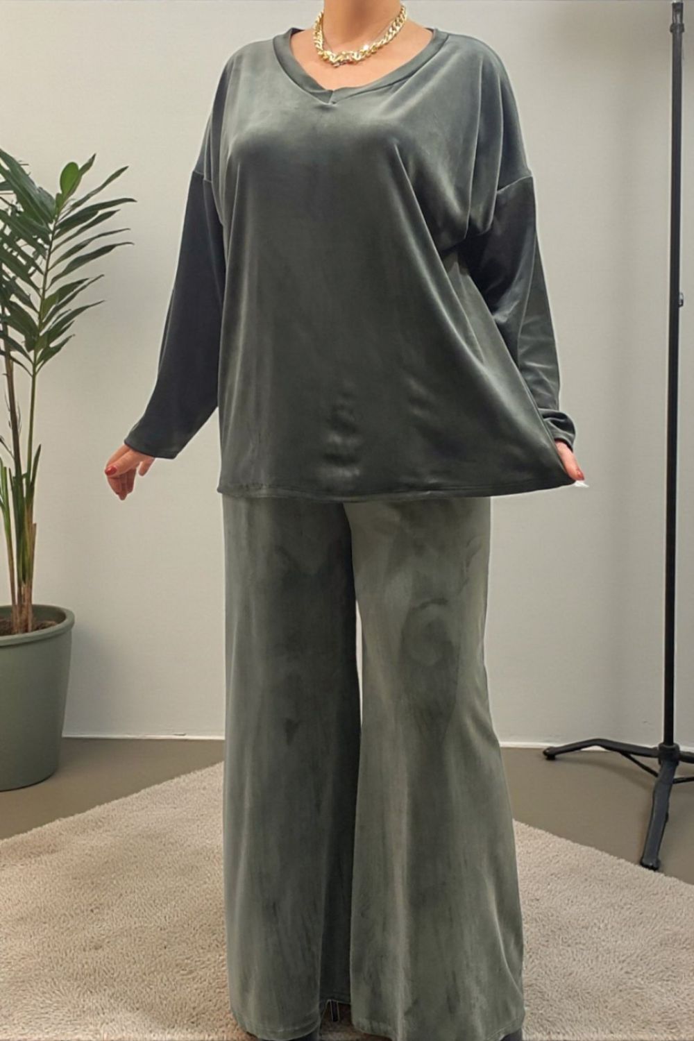 ΑΝΑΝΕΩΣΤΕ ΤΟ CASUAL LOOK ΣΑΣ ΜΕ ΑΥΤΟ ΤΟ PLUS SIZE ΒΕΛΟΥΔΙΝΟ ΣΕΤ ΠΟΥ ΣΥΝΔΥΑΖΕΙ ΑΝΕΣΗ ΚΑΙ ΚΟΜΨΟΤΗΤΑ.ΔΙΑΘΕΤΕΙ ΚΟΜΨΟ V ΑΝΟΙΓΜΑ ΜΠΡΟΣΤΑ ΚΑΙ ΚΑΛΥΠΤΕΙ ΣΤΗΘΟΣ ΕΩΣ 160CM ΚΑΙ ΠΕΡΙΦΕΡΕΙΑ ΕΩΣ 170CM.ΜΗΚΟΣ 73CM.Η ΠΑΝΤΕΛΟΝΑ ΜΕ ΛΑΣΤΙΧΟ ΣΤΗ ΜΕΣΗ ΠΡΟΣΦΕΡΕΙ ΑΝΕΤΗ ΚΑΙ ΤΕΛΕΙΑ ΕΦΑΡΜΟΓΗ.ΚΑΛΥΠΤΕΙ ΜΕΣΗ ΕΩΣ 150CM ΚΑΙ ΠΕΡΙΦΕΡΕΙΑ ΕΩΣ 158CM.ΙΔΑΝΙΚΟ ΓΙΑ ΟΛΕΣ ΤΙΣ ΩΡΕΣ