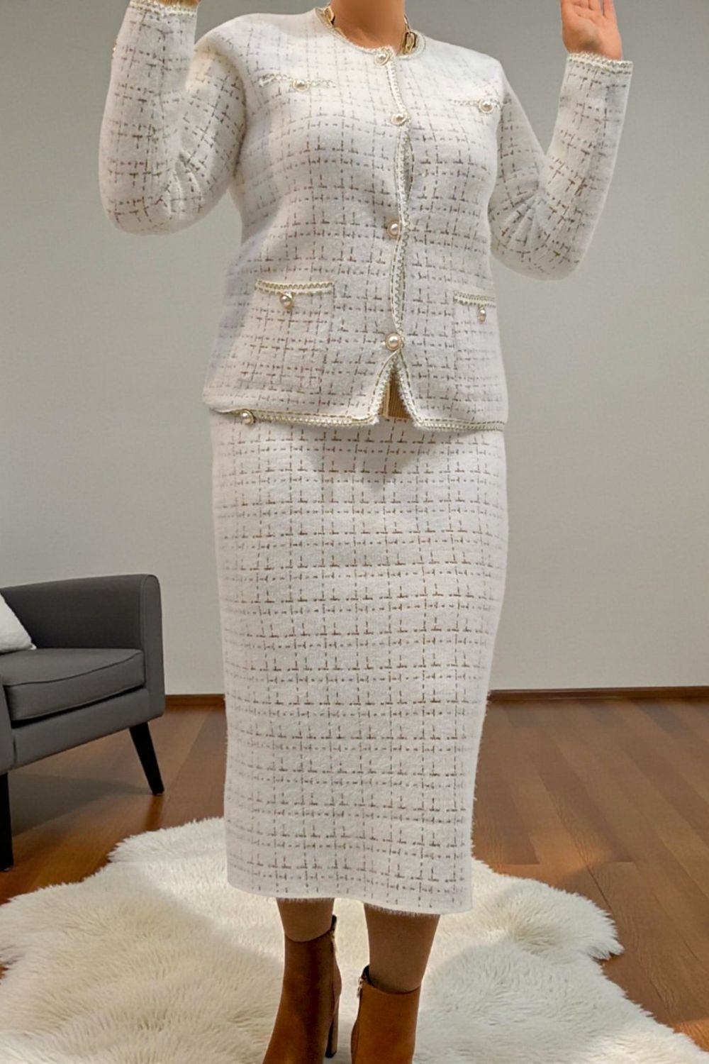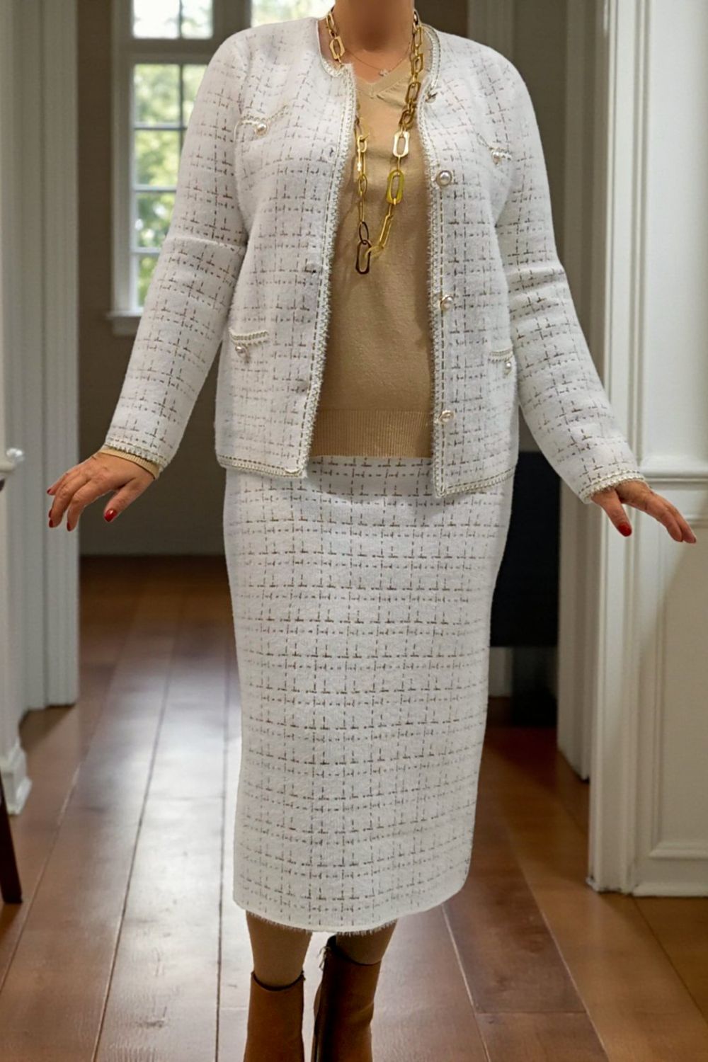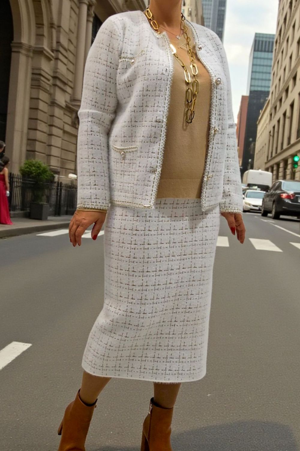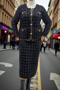 ΚΟΜΨΟ ΤΑΓΕΡ ΣΕ ΣΤΥΛ CHANNEL.ΤΟ ΣΥΝΟΛΟ ΑΠΟΤΕΛΕΙΤΑΙ ΑΠΟ ΣΑΚΑΚΙ ΜΕ ΜΑΚΡΥ ΜΑΝΙΚΙ ΣΕ ΥΦΑΣΜΑ ΤΥΠΟΥ ΤΟΥΙΝΤ. ΕΧΕΙ ΤΣΕΠΕΣ ΜΠΡΟΣΤΑ ΔΙΑΚΟΣΜΗΤΙΚΑ ΚΟΥΜΠΙΑ ΜΕ ΧΡΥΣΕΣ ΛΕΠΤΟΜΕΡΕΙΕΣ ΚΑΙ ΜΑΥΡΟ ΧΡΥΣΟ ΤΕΛΕΙΩΜΑ ΣΤΙΣ ΑΚΡΕΣ. ΚΛΕΙΝΕΙ ΜΠΡΟΣΤΑ ΜΕ ΧΡΥΣΑ ΚΟΥΜΠΙΑ. ΚΑΛΥΠΤΕΙ ΣΤΗΘΟΣ ΕΩΣ 124CM, ΜΕΣΗ ΕΩΣ 126CM, ΜΗΚΟΣ 64CM. Η ΦΟΥΣΤΑ ΣΕ ΜΗΚΟΣ ΚΑΤΩ ΑΠΟ ΤΟ ΓΟΝΑΤΟ , ΑΠΟ ΤΟ ΙΔΙΟ ΥΦΑΣΜΑ ΚΑΙ ΣΧΕΔΙΟ, ΜΕ ΜΠΑΣΚΑ ΕΛΑΣΤΙΚΗ ΣΤΗ ΜΕΣΗ ΚΑΙ ΔΥΟ ΔΙΑΚΟΣΜΗΤΙΚΑ ΤΣΕΠΑΚΙΑ, ΔΗΜΙΟΥΡΓΕΙ ΕΝΑ ΟΛΟΚΛΗΡΩΜΕΝΟ ΚΟΥΣΤΟΥΜΙ. ΚΑΛΥΠΤΕΙ ΜΕΣΗ ΕΩΣ 118CM, ΠΕΡΙΦΕΡΕΙΑ ΕΩΣ 126CM, ΜΗΚΟΣ 82CM.ΣΥΝΘΕΣΗ 28%POLYAMIDE, 25%VISCOSE, 22%MODAL, 16%COTTON, 10%ELASTIN