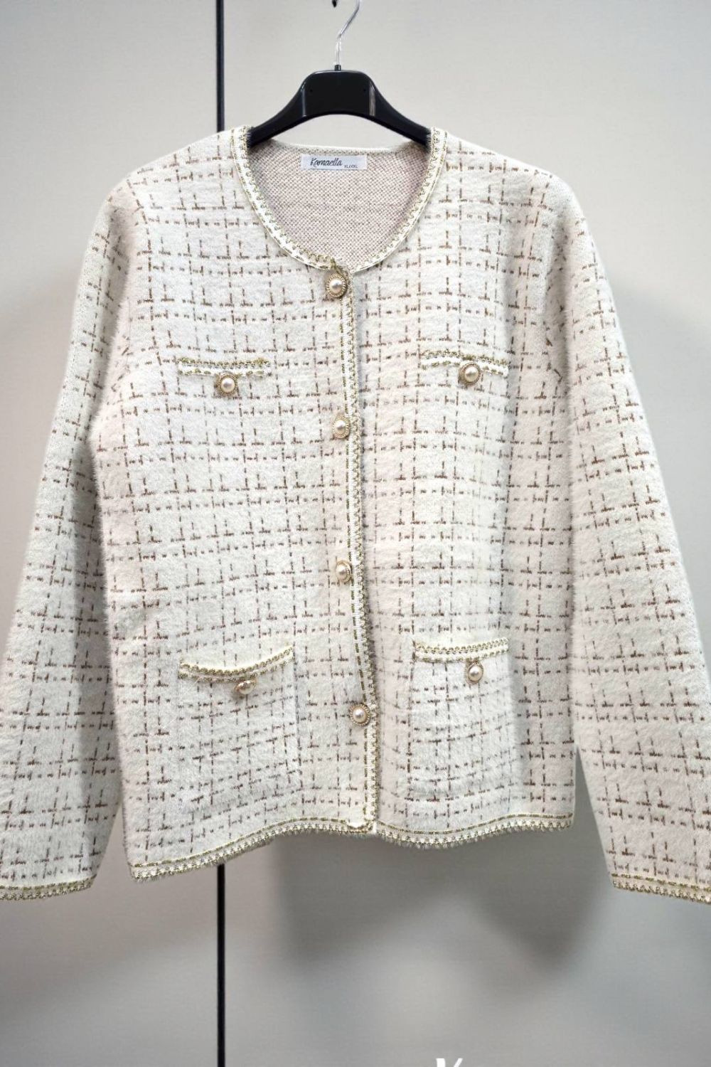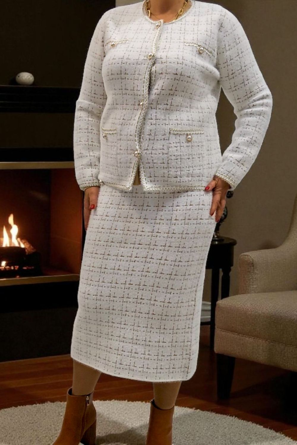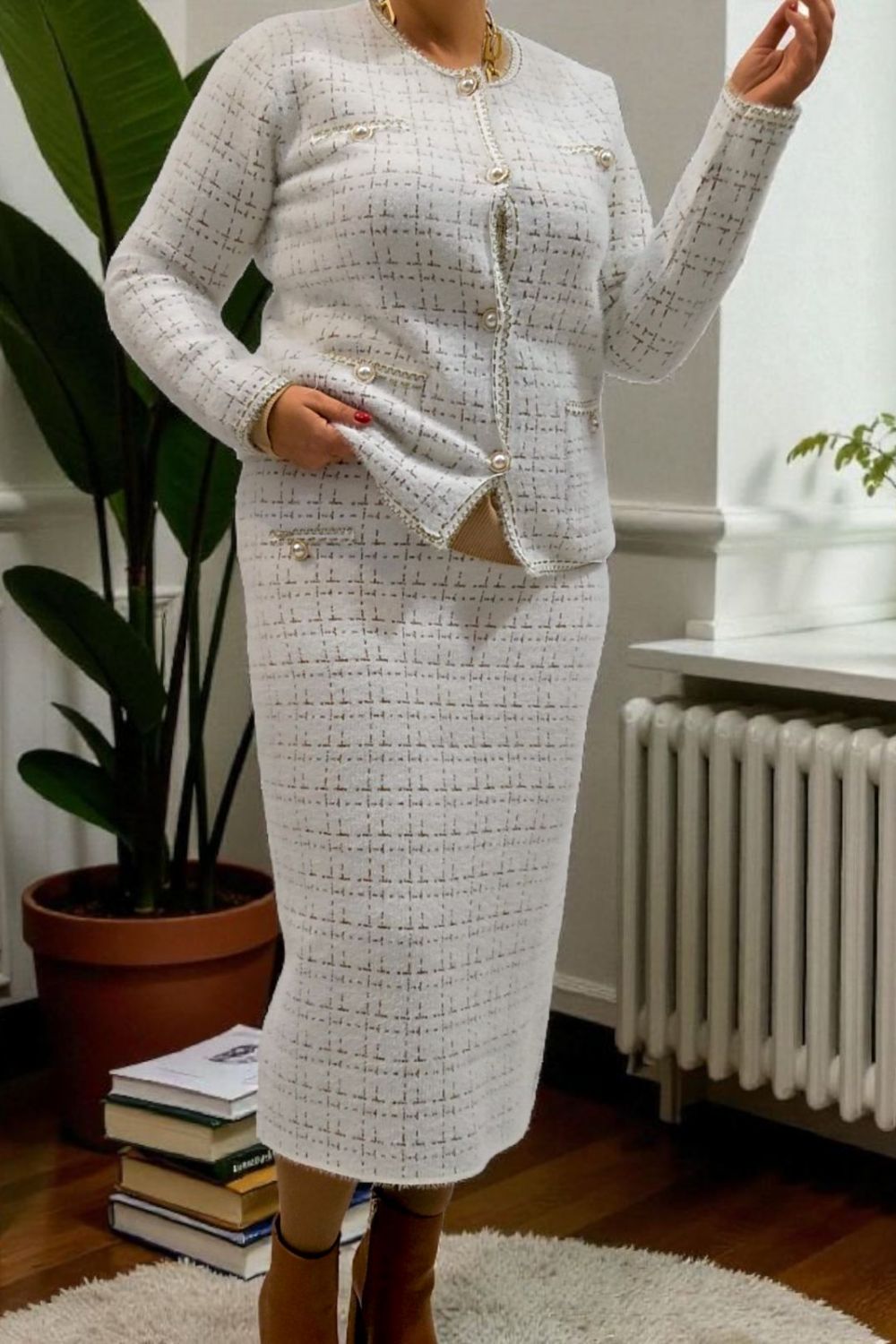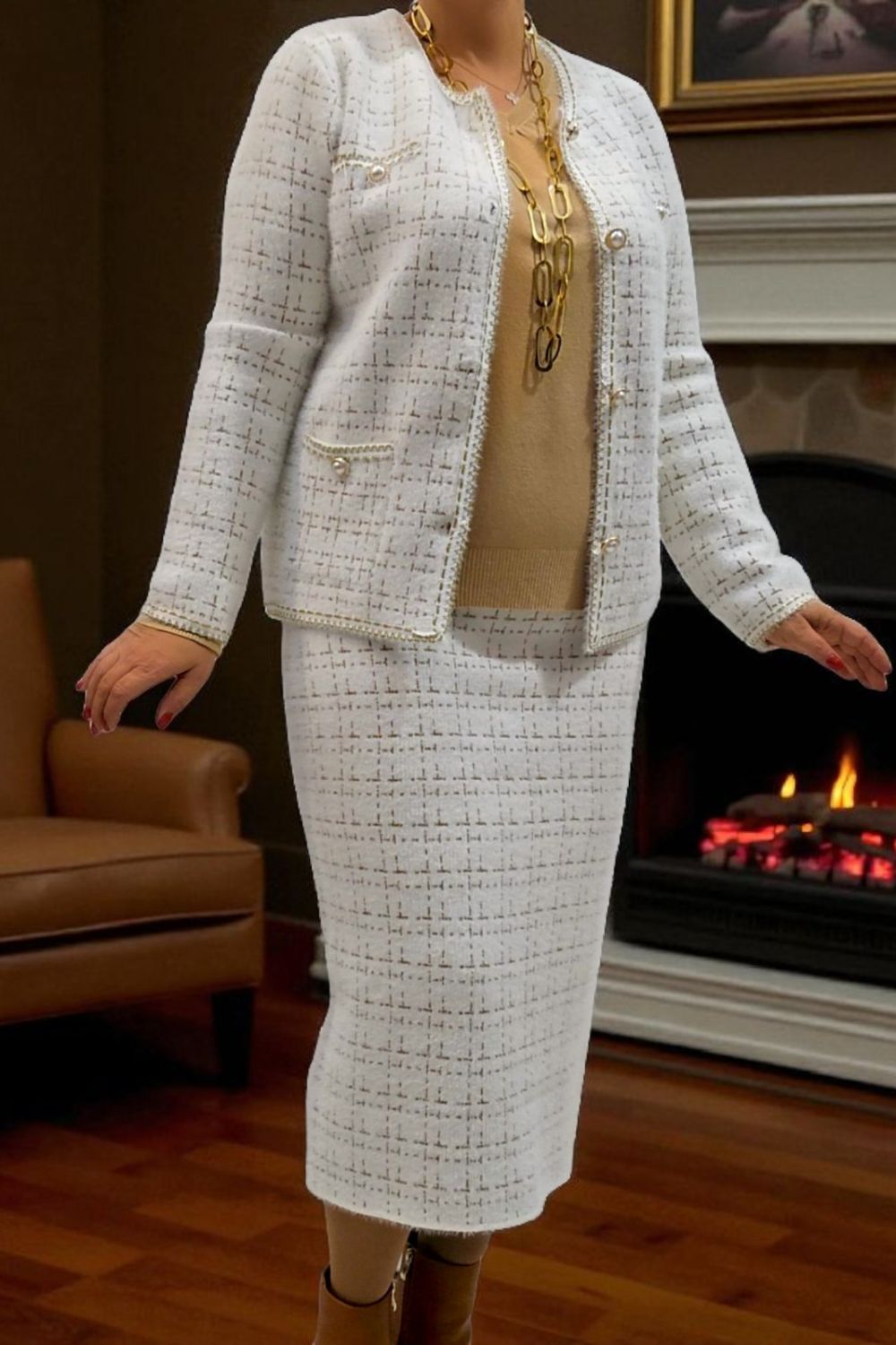 ΚΟΜΨΟ ΤΑΓΕΡ ΣΕ ΣΤΥΛ CHANNEL.ΤΟ ΣΥΝΟΛΟ ΑΠΟΤΕΛΕΙΤΑΙ ΑΠΟ ΣΑΚΑΚΙ ΜΕ ΜΑΚΡΥ ΜΑΝΙΚΙ ΣΕ ΥΦΑΣΜΑ ΤΥΠΟΥ ΤΟΥΙΝΤ. ΕΧΕΙ ΤΣΕΠΕΣ ΜΠΡΟΣΤΑ ΔΙΑΚΟΣΜΗΤΙΚΑ ΚΟΥΜΠΙΑ ΜΕ ΧΡΥΣΕΣ ΛΕΠΤΟΜΕΡΕΙΕΣ ΚΑΙ ΜΑΥΡΟ ΧΡΥΣΟ ΤΕΛΕΙΩΜΑ ΣΤΙΣ ΑΚΡΕΣ. ΚΛΕΙΝΕΙ ΜΠΡΟΣΤΑ ΜΕ ΧΡΥΣΑ ΚΟΥΜΠΙΑ. ΚΑΛΥΠΤΕΙ ΣΤΗΘΟΣ ΕΩΣ 124CM, ΜΕΣΗ ΕΩΣ 126CM, ΜΗΚΟΣ 64CM. Η ΦΟΥΣΤΑ ΣΕ ΜΗΚΟΣ ΚΑΤΩ ΑΠΟ ΤΟ ΓΟΝΑΤΟ , ΑΠΟ ΤΟ ΙΔΙΟ ΥΦΑΣΜΑ ΚΑΙ ΣΧΕΔΙΟ, ΜΕ ΜΠΑΣΚΑ ΕΛΑΣΤΙΚΗ ΣΤΗ ΜΕΣΗ ΚΑΙ ΔΥΟ ΔΙΑΚΟΣΜΗΤΙΚΑ ΤΣΕΠΑΚΙΑ, ΔΗΜΙΟΥΡΓΕΙ ΕΝΑ ΟΛΟΚΛΗΡΩΜΕΝΟ ΚΟΥΣΤΟΥΜΙ. ΚΑΛΥΠΤΕΙ ΜΕΣΗ ΕΩΣ 118CM, ΠΕΡΙΦΕΡΕΙΑ ΕΩΣ 126CM, ΜΗΚΟΣ 82CM.ΣΥΝΘΕΣΗ 28%POLYAMIDE, 25%VISCOSE, 22%MODAL, 16%COTTON, 10%ELASTIN