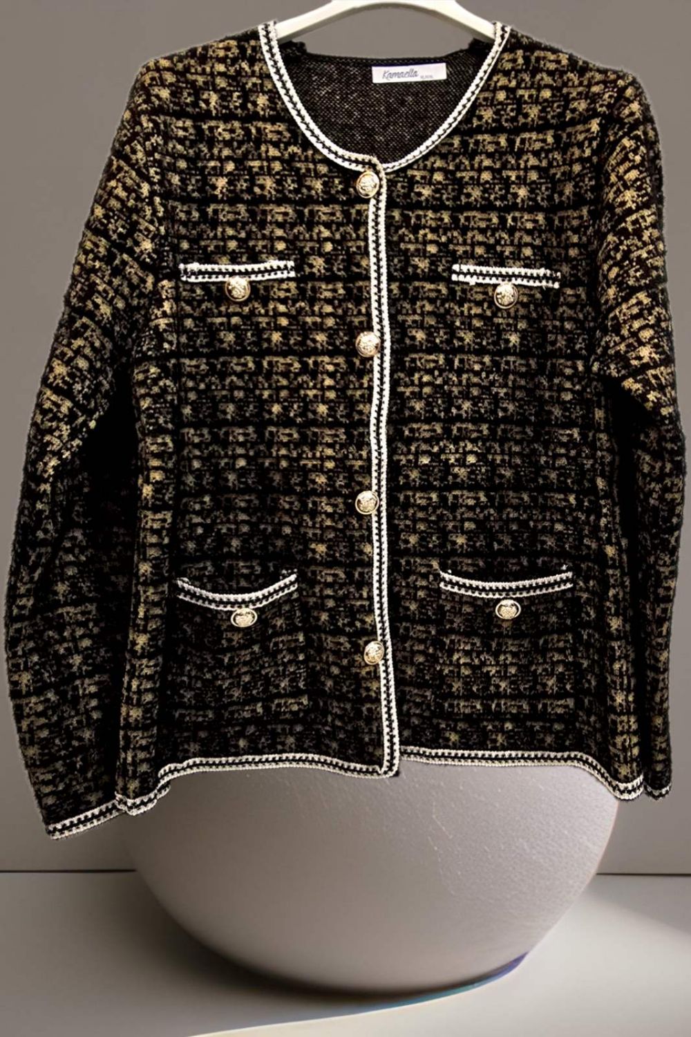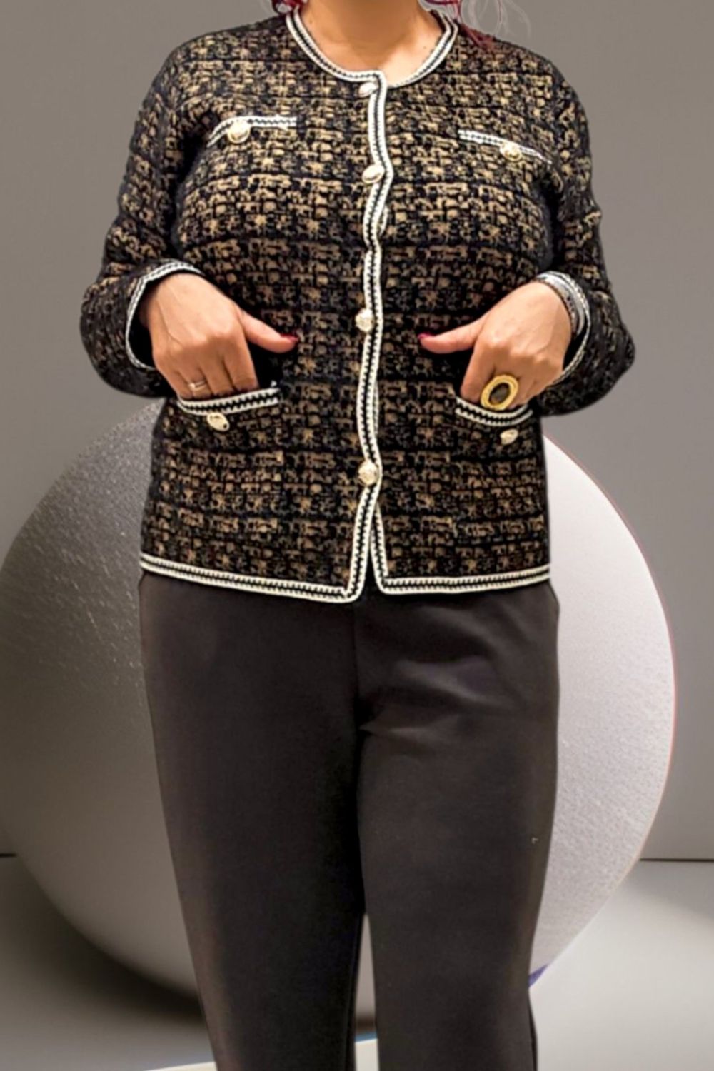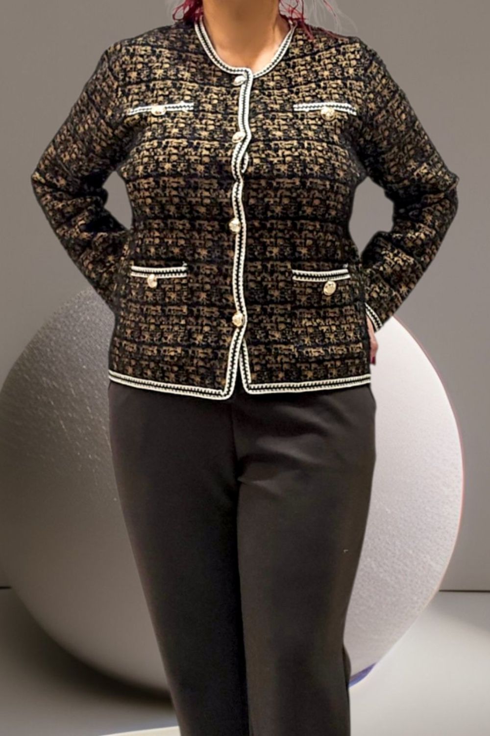 ΚΟΜΨΗ ΖΑΚΕΤΑ ΣΕ ΣΤΥΛ CHANNEL ΜΕ ΜΑΚΡΥ ΜΑΝΙΚΙ ΣΕ ΥΦΑΣΜΑ ΤΥΠΟΥ ΤΟΥΙΝΤ. ΕΧΕΙ ΤΣΕΠΕΣ ΜΠΡΟΣΤΑ ΔΙΑΚΟΣΜΗΤΙΚΑ ΚΟΥΜΠΙΑ ΜΕ ΧΡΥΣΕΣ ΛΕΠΤΟΜΕΡΕΙΕΣ ΚΑΙ ΜΑΥΡΟ ΧΡΥΣΟ ΤΕΛΕΙΩΜΑ ΣΤΙΣ ΑΚΡΕΣ. ΚΛΕΙΝΕΙ ΜΠΡΟΣΤΑ ΜΕ ΧΡΥΣΑ ΚΟΥΜΠΙΑ. ΣΥΝΘΕΣΗ 28% POLYAMIDE 25% VISCOSE 22% MODAL 15% COTTON 10% ELASTIN