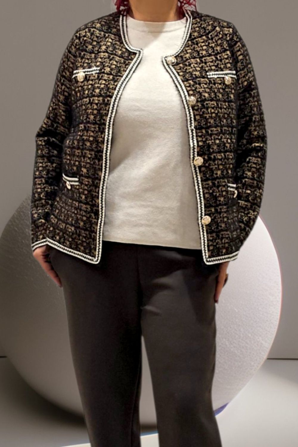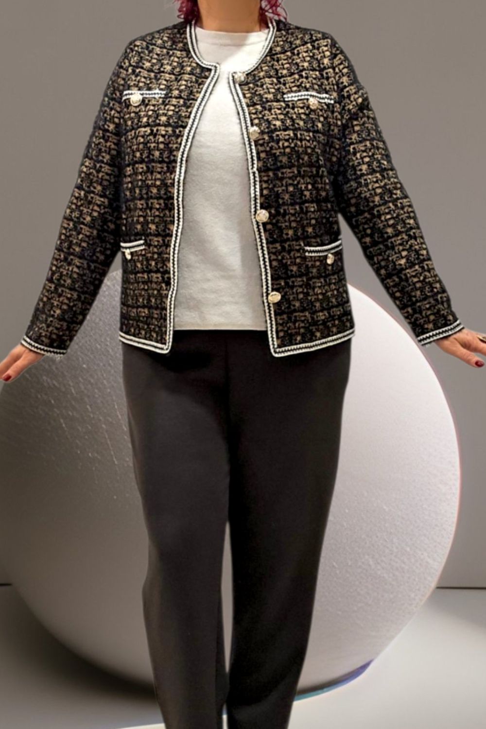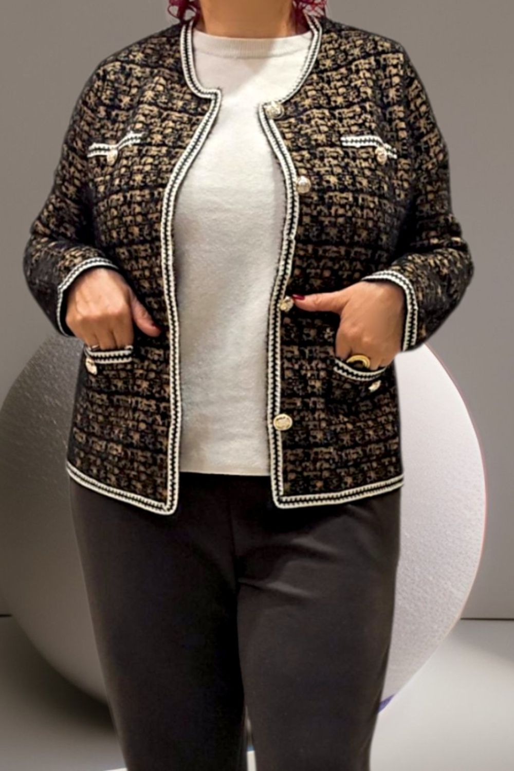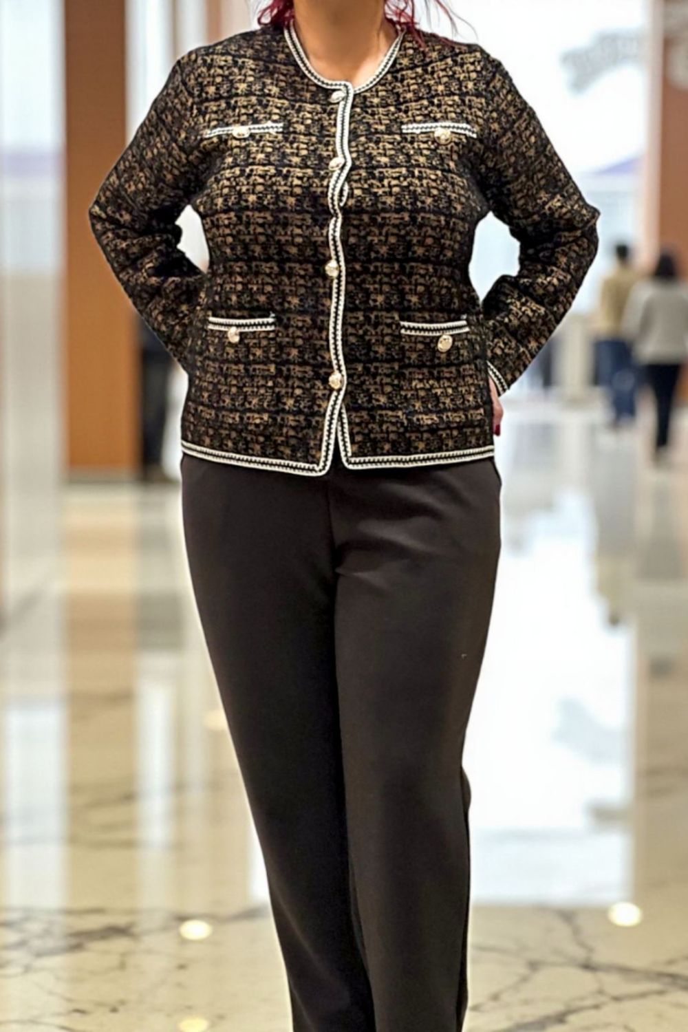 ΚΟΜΨΗ ΖΑΚΕΤΑ ΣΕ ΣΤΥΛ CHANNEL ΜΕ ΜΑΚΡΥ ΜΑΝΙΚΙ ΣΕ ΥΦΑΣΜΑ ΤΥΠΟΥ ΤΟΥΙΝΤ. ΕΧΕΙ ΤΣΕΠΕΣ ΜΠΡΟΣΤΑ ΔΙΑΚΟΣΜΗΤΙΚΑ ΚΟΥΜΠΙΑ ΜΕ ΧΡΥΣΕΣ ΛΕΠΤΟΜΕΡΕΙΕΣ ΚΑΙ ΜΑΥΡΟ ΧΡΥΣΟ ΤΕΛΕΙΩΜΑ ΣΤΙΣ ΑΚΡΕΣ. ΚΛΕΙΝΕΙ ΜΠΡΟΣΤΑ ΜΕ ΧΡΥΣΑ ΚΟΥΜΠΙΑ. ΣΥΝΘΕΣΗ 28% POLYAMIDE 25% VISCOSE 22% MODAL 15% COTTON 10% ELASTIN