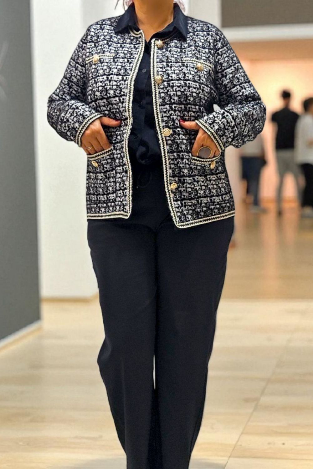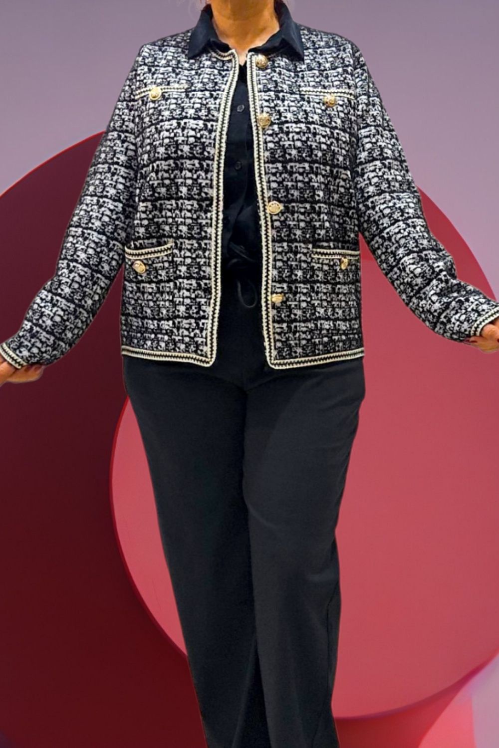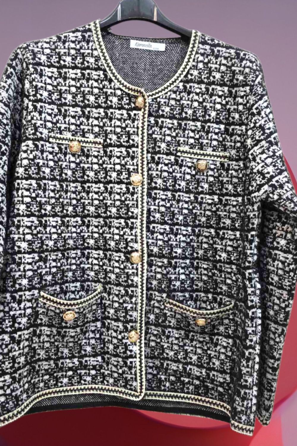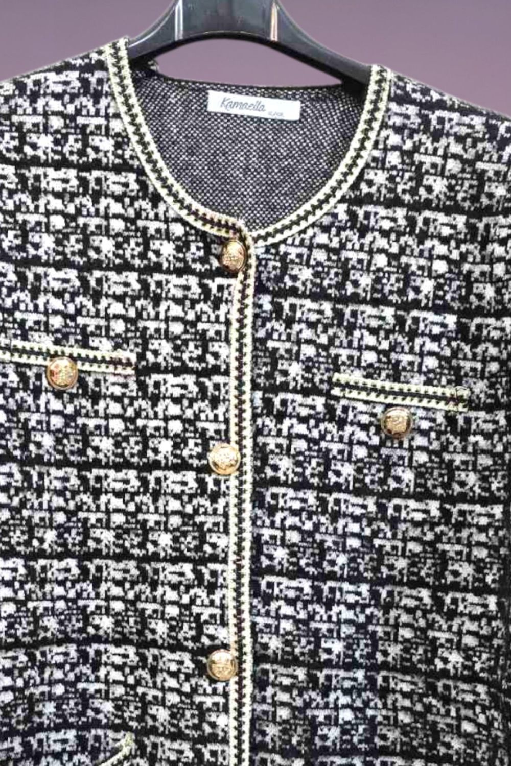 ΚΟΜΨΗ ΖΑΚΕΤΑ ΣΕ ΣΤΥΛ CHANNEL ΜΕ ΜΑΚΡΥ ΜΑΝΙΚΙ ΣΕ ΥΦΑΣΜΑ ΤΥΠΟΥ ΤΟΥΙΝΤ. ΕΧΕΙ ΤΣΕΠΕΣ ΜΠΡΟΣΤΑ ΔΙΑΚΟΣΜΗΤΙΚΑ ΚΟΥΜΠΙΑ ΜΕ ΧΡΥΣΕΣ ΛΕΠΤΟΜΕΡΕΙΕΣ ΚΑΙ ΜΑΥΡΟ ΧΡΥΣΟ ΤΕΛΕΙΩΜΑ ΣΤΙΣ ΑΚΡΕΣ. ΚΛΕΙΝΕΙ ΜΠΡΟΣΤΑ ΜΕ ΧΡΥΣΑ ΚΟΥΜΠΙΑ. ΣΥΝΘΕΣΗ 28% POLYAMIDE 25% VISCOSE 22% MODAL 15% COTTON 10% ELASTIN