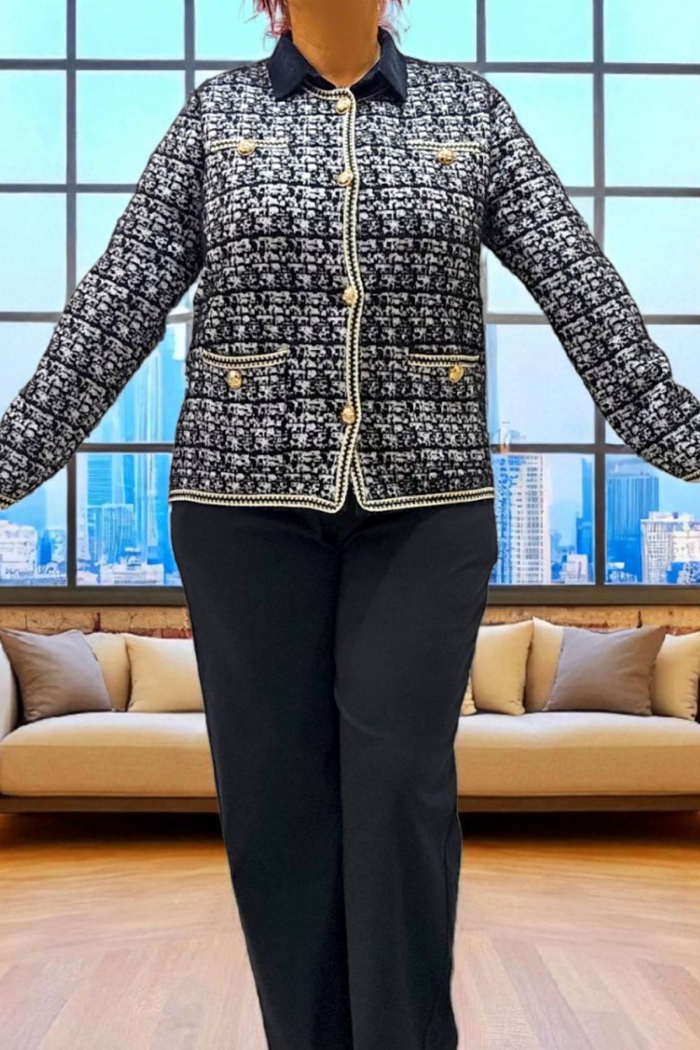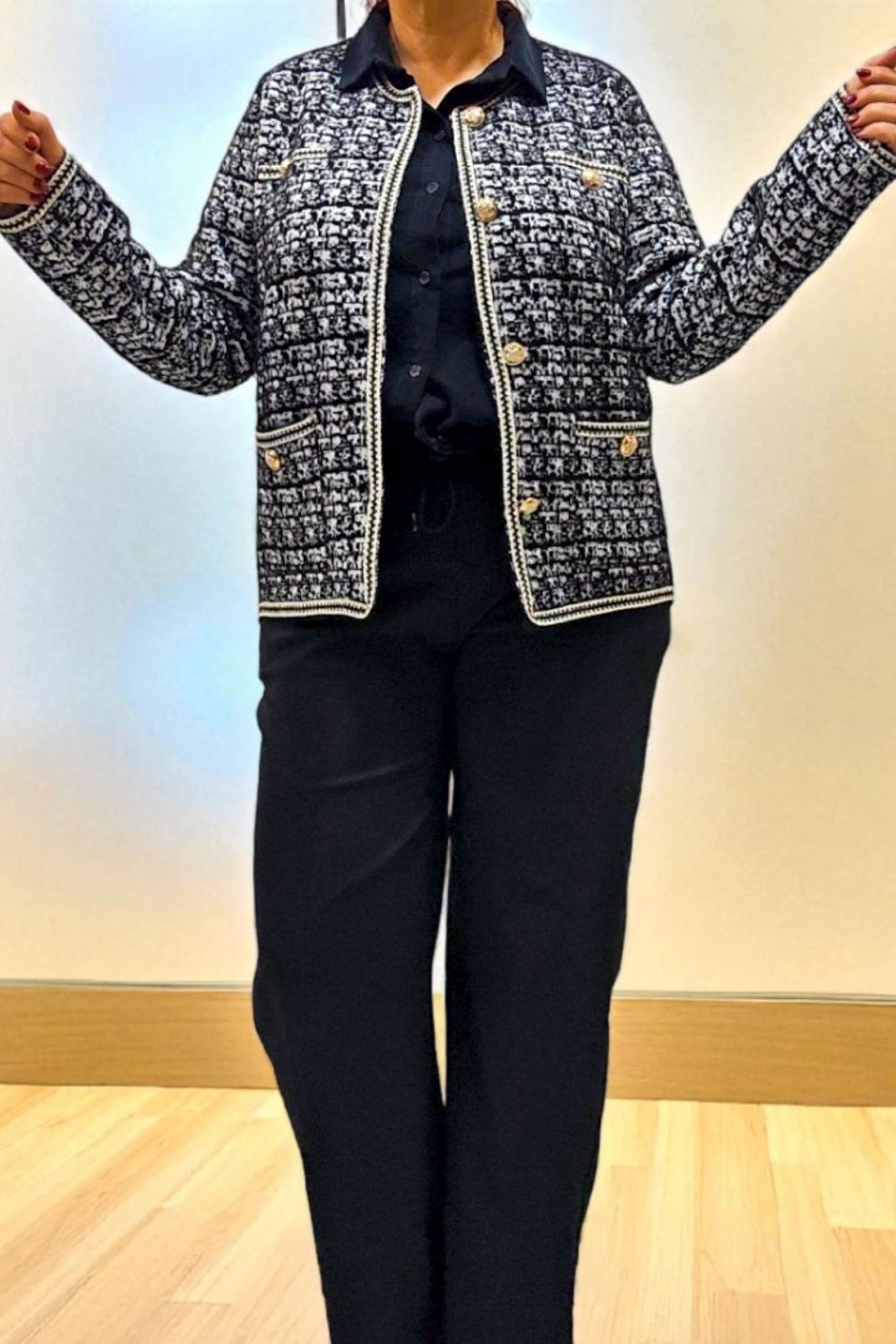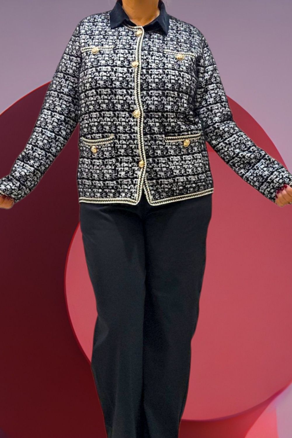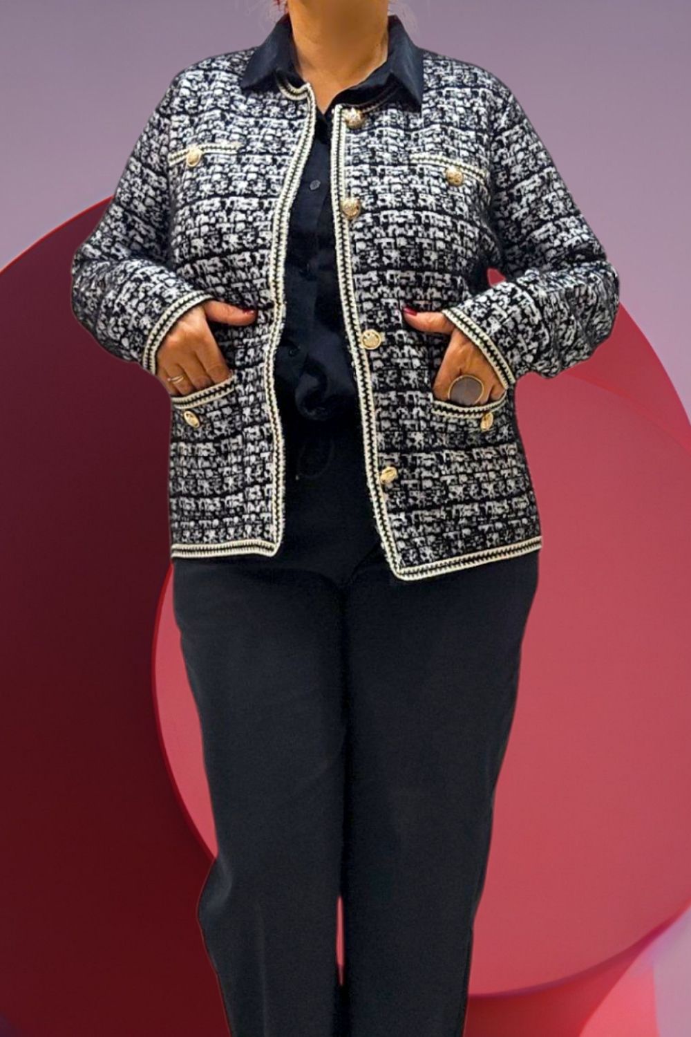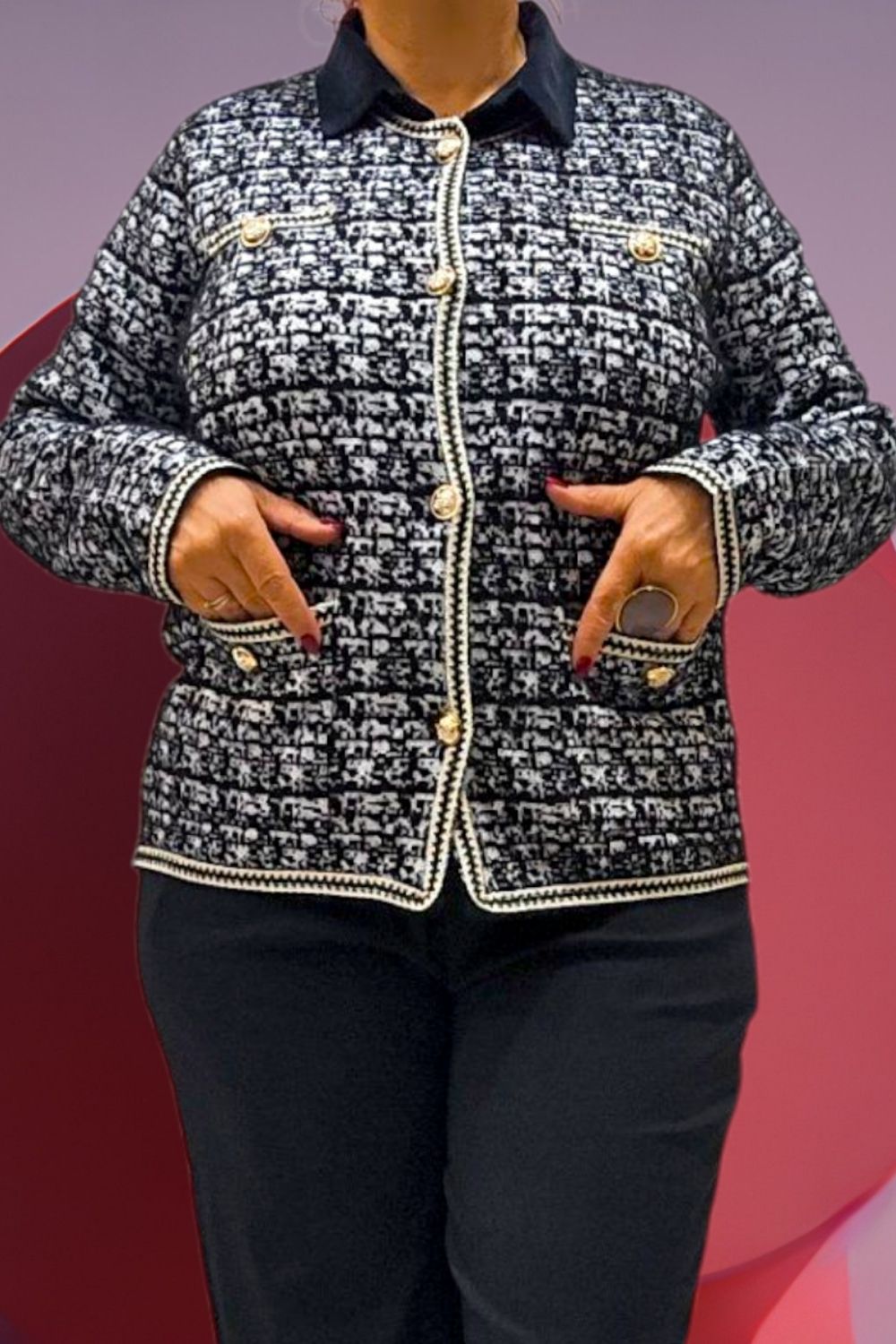 ΚΟΜΨΗ ΖΑΚΕΤΑ ΣΕ ΣΤΥΛ CHANNEL ΜΕ ΜΑΚΡΥ ΜΑΝΙΚΙ ΣΕ ΥΦΑΣΜΑ ΤΥΠΟΥ ΤΟΥΙΝΤ. ΕΧΕΙ ΤΣΕΠΕΣ ΜΠΡΟΣΤΑ ΔΙΑΚΟΣΜΗΤΙΚΑ ΚΟΥΜΠΙΑ ΜΕ ΧΡΥΣΕΣ ΛΕΠΤΟΜΕΡΕΙΕΣ ΚΑΙ ΜΑΥΡΟ ΧΡΥΣΟ ΤΕΛΕΙΩΜΑ ΣΤΙΣ ΑΚΡΕΣ. ΚΛΕΙΝΕΙ ΜΠΡΟΣΤΑ ΜΕ ΧΡΥΣΑ ΚΟΥΜΠΙΑ. ΣΥΝΘΕΣΗ 28% POLYAMIDE 25% VISCOSE 22% MODAL 15% COTTON 10% ELASTIN